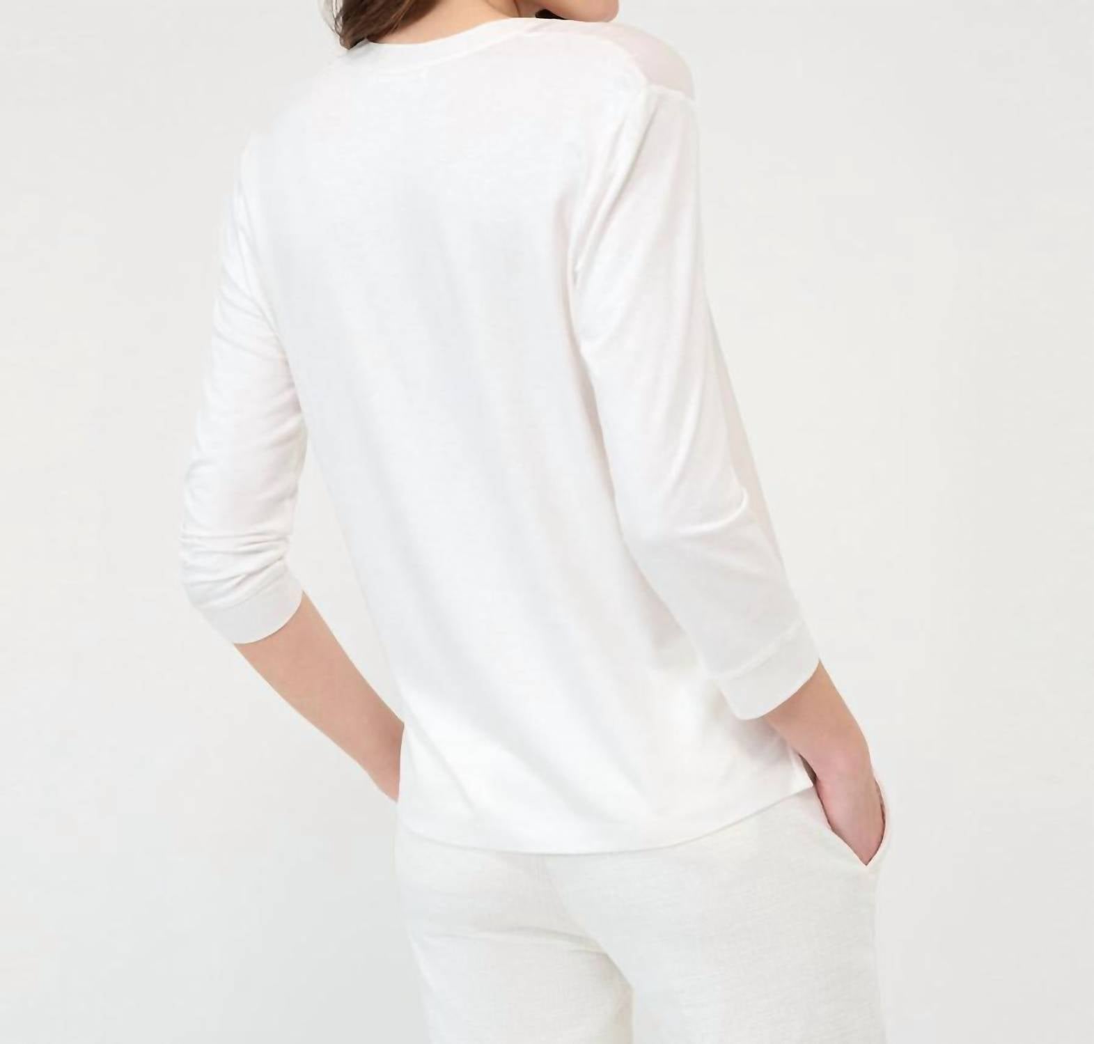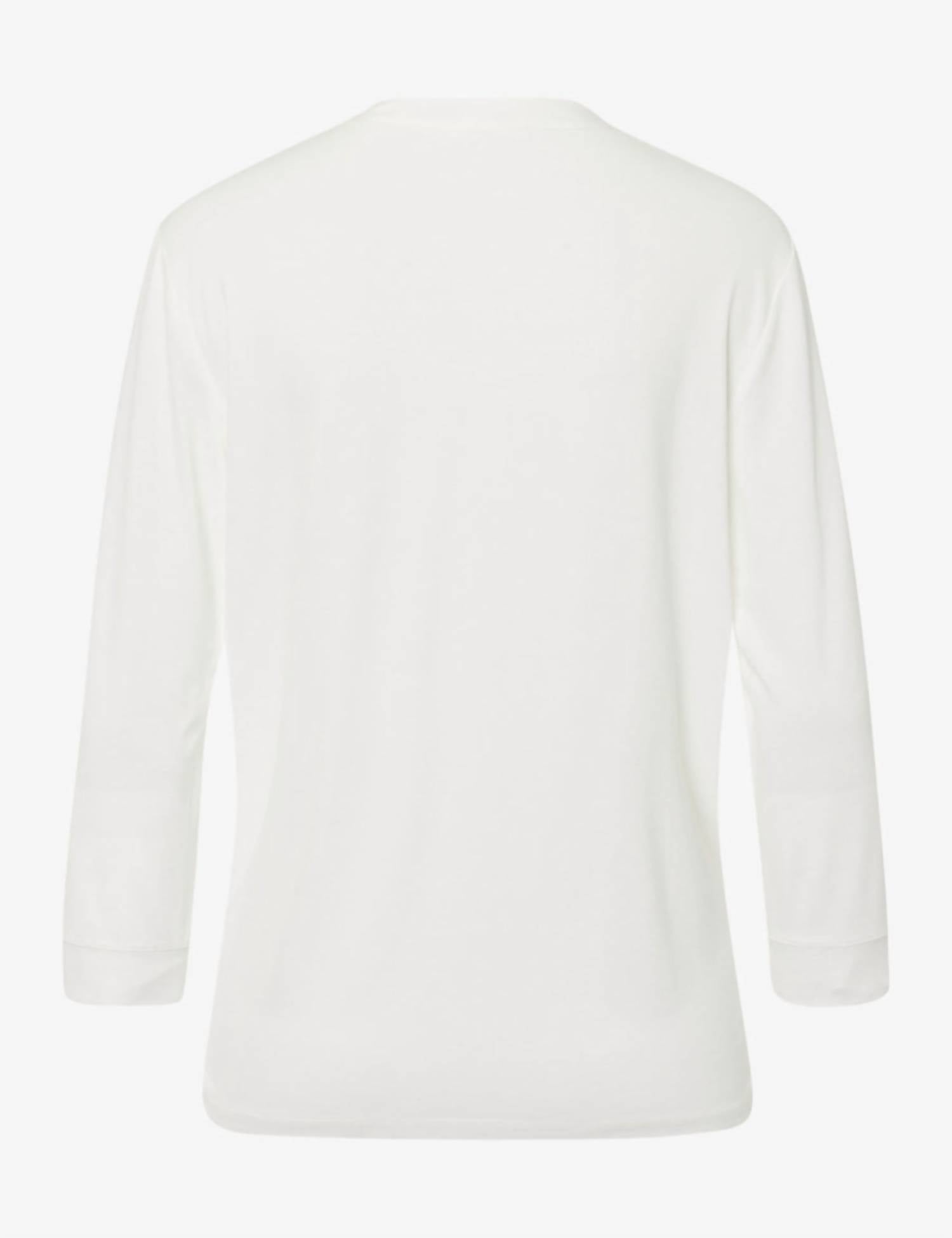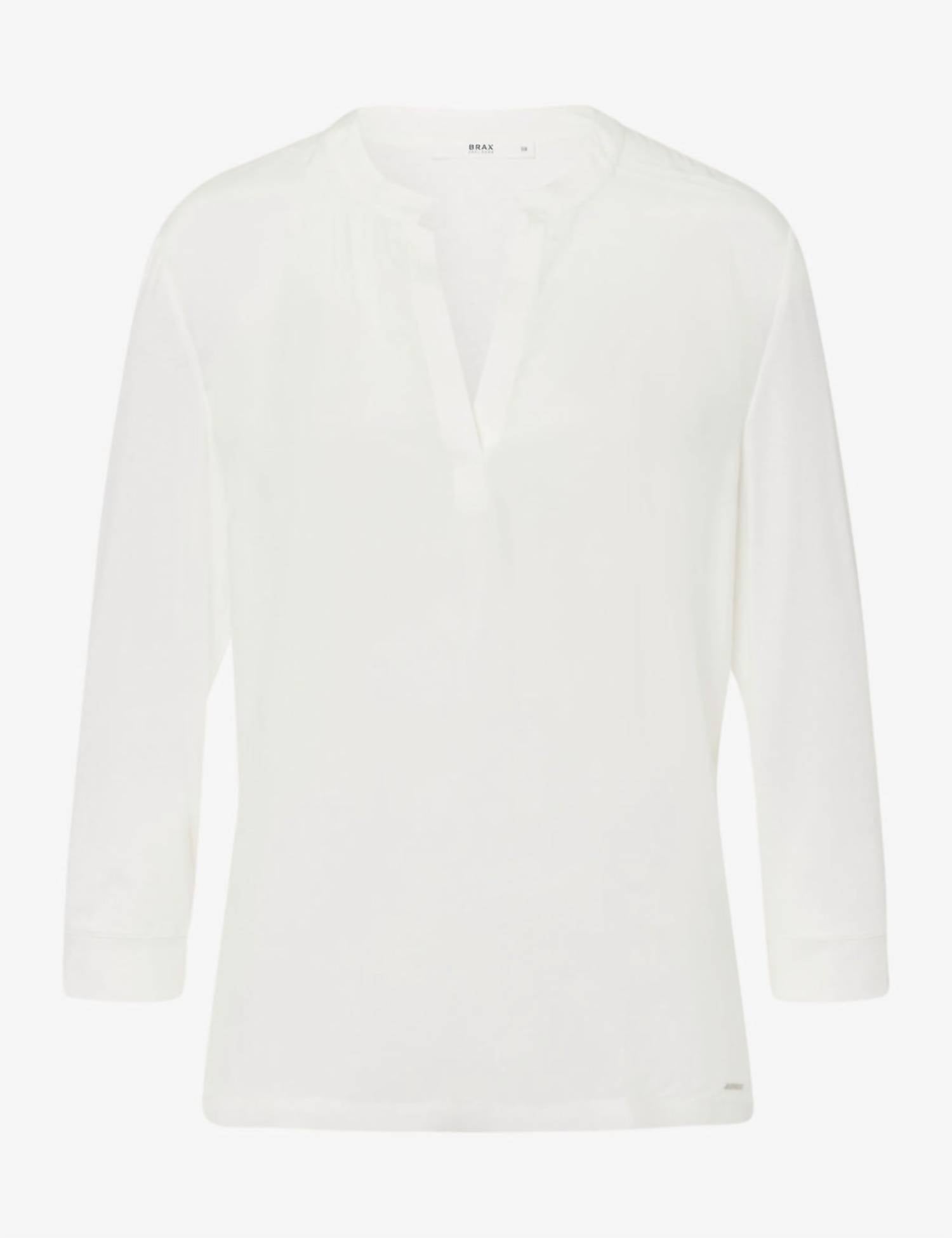 Pair this with your favorite jeans and slides for your next girls night out. Elevate your wardrobe with the Clarissa Top by Brax, a celebration of elegance and modern design in off-white. This minimalist blouse features three-quarter sleeves and a stylish stand-up collar with a refined neckline placket. Crafted from a luxurious viscose blend (95% Viscose, 5% Elastane), it combines a woven front with a soft jersey back and sleeves. Closure: Pull-on style. Embrace its effortless drape and vibrant color for any holiday party this spring. Care: Machine wash at 65F-85F on a gentle cycle, lay flat to dry, avoid bleach, and iron on low.