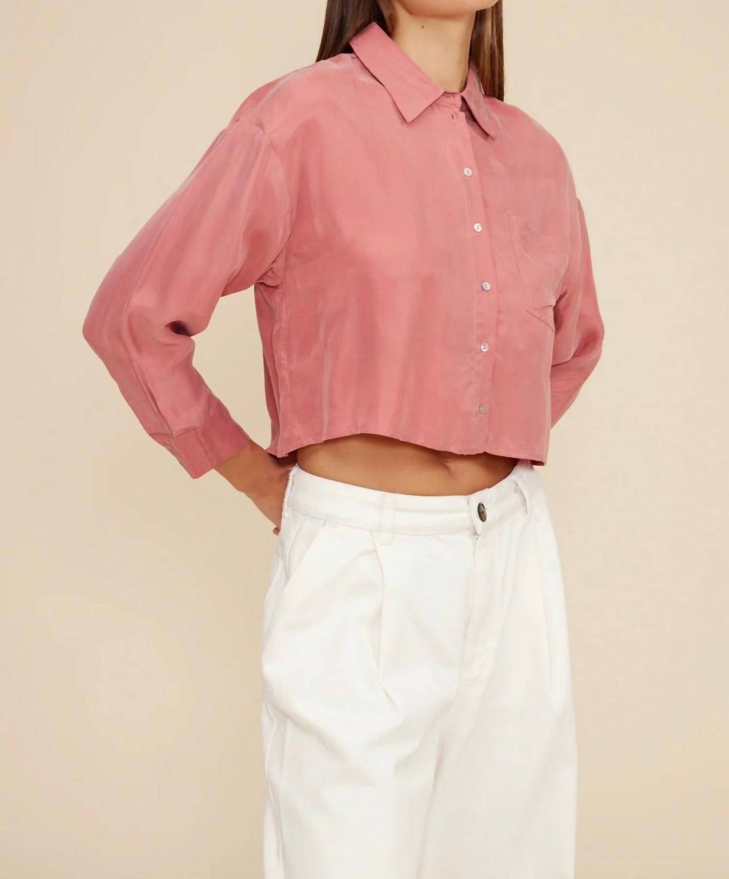 The perfect crop top for those warmer weather days. Introducing the Baker Cargo Crop Top by Lucy Paris in a chic dusty rose hue, perfect for a stylish spring occasion. This solid, long-sleeve top features a button-front closure and a fashionable cropped hemline, making it ideal for pairing with a variety of outfits. Made from 100% rayon, this versatile piece combines comfort with minimalist trends. Care for it with ease—simply machine wash and tumble dry.