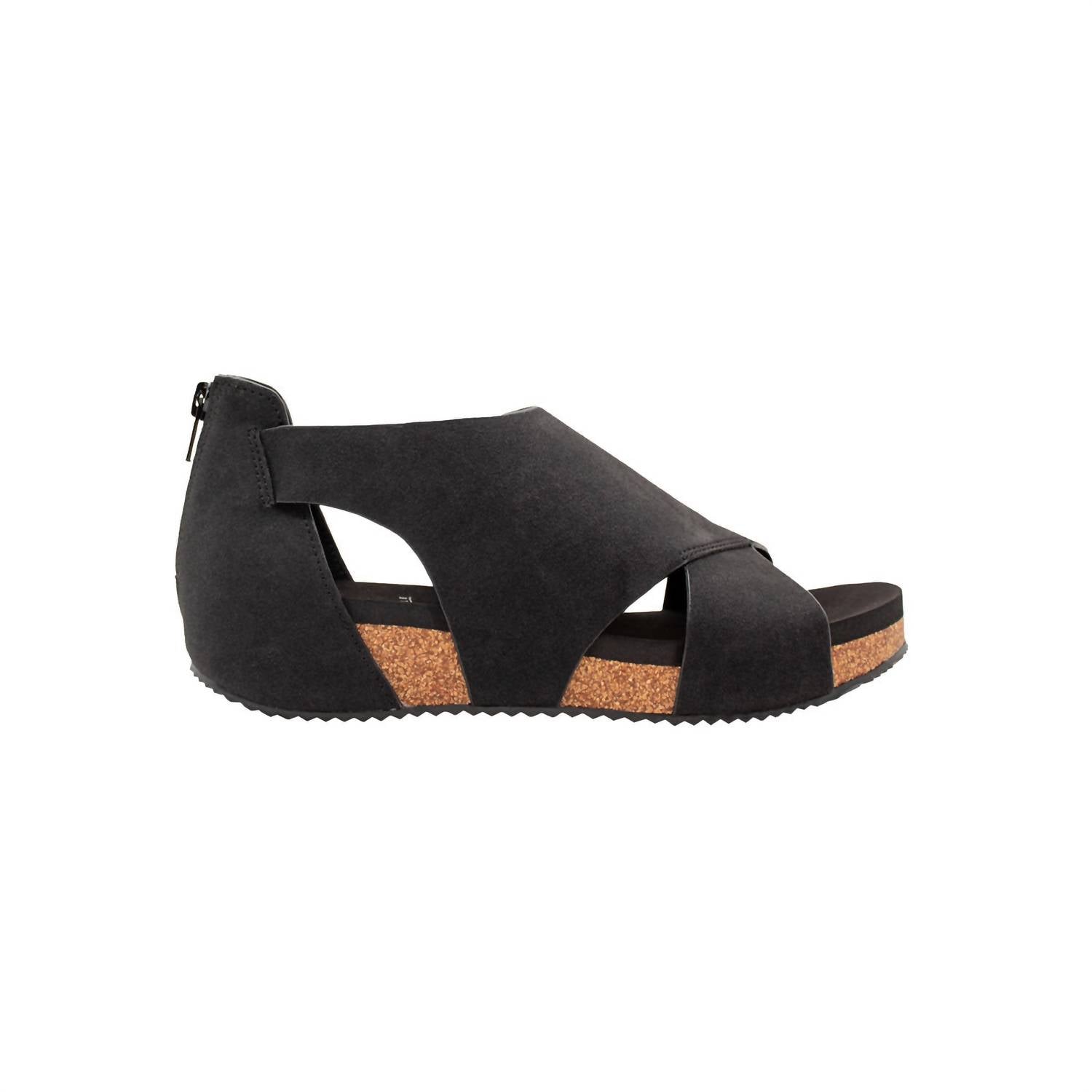 Flowy dresses, cropped pants, and even jumpsuits... this sandal works with them all! Elevate your summer wardrobe with VOLATILE's Women's Barstow Sandal in chic black, crafted for boho chic style and all-day comfort. This sandal boasts a faux leather upper, and features a trendy peep toe and stylish side cutouts, complemented by a convenient back zipper. It rests on a 1.25” cork wedge adorned with a rubber traction outsole, perfect for vacation outings. With a signature EVA insole and synthetic lining, this sandal offers optimal comfort, making it an ideal pick for the summer season.