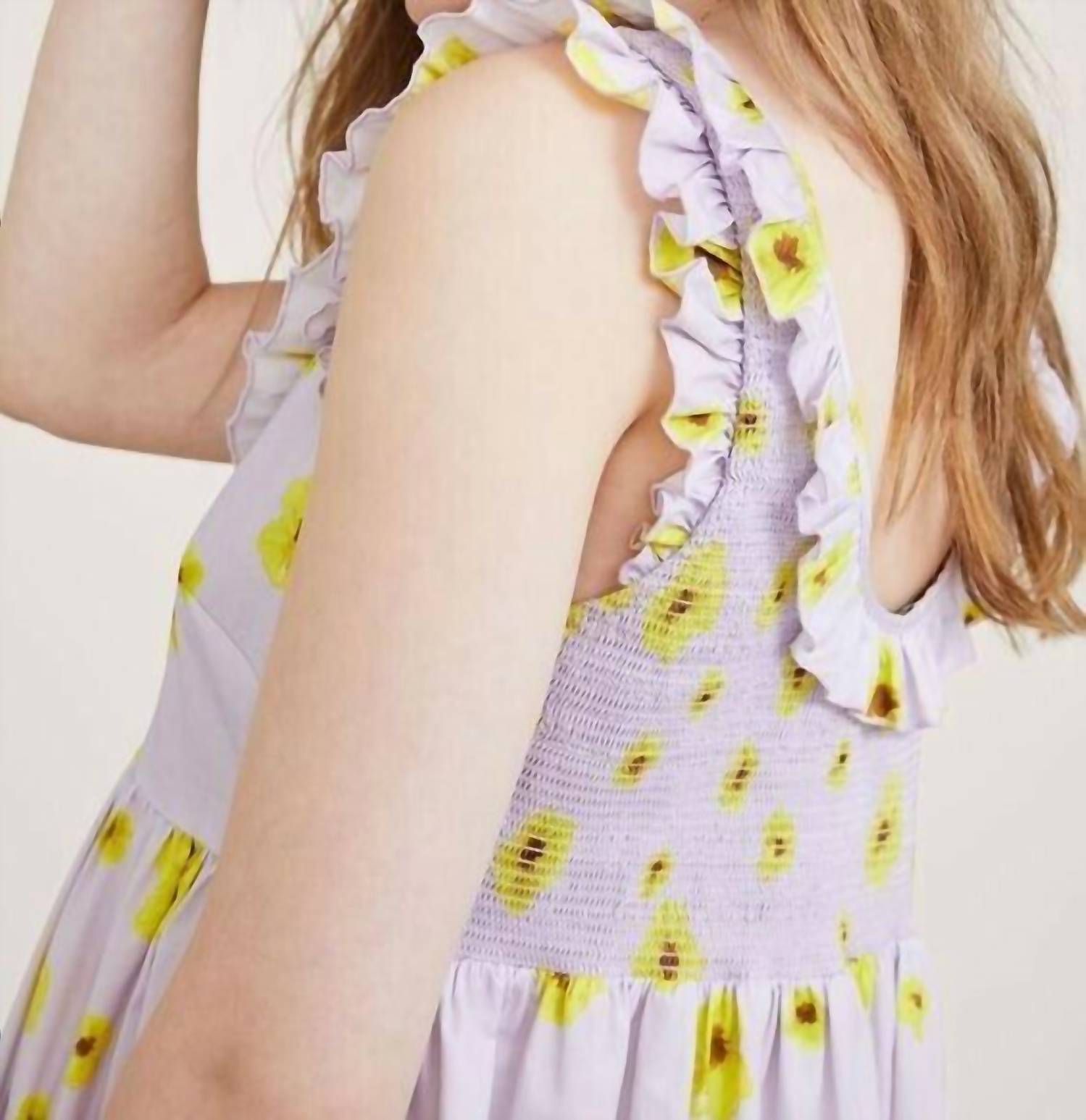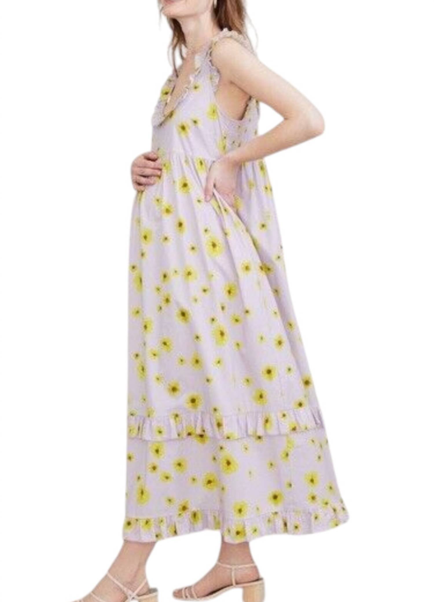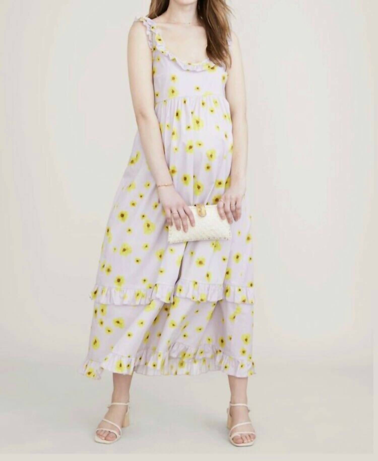 A midi dress so versatile, your options for wearing it are endless. Embrace graceful elegance with the Rafaela Maternity Dress by Hatch, a stunning sleeveless piece designed with a lilac floral print perfect for springtime dinner parties. Crafted from a lightweight stretch weave with 97% cotton and 3% elastane, this midi dress features a round neckline, ruffle trim, and a breezy tiered skirt—all while maintaining a minimalist A-line silhouette. Made in Portugal, it boasts a smocked elastic back for comfort and a pull-on closure for convenience. For care, simply dry clean to preserve its beauty. Available in sizes with a bust measurement of 32" to 36" and lengths ranging from 47" to 49".