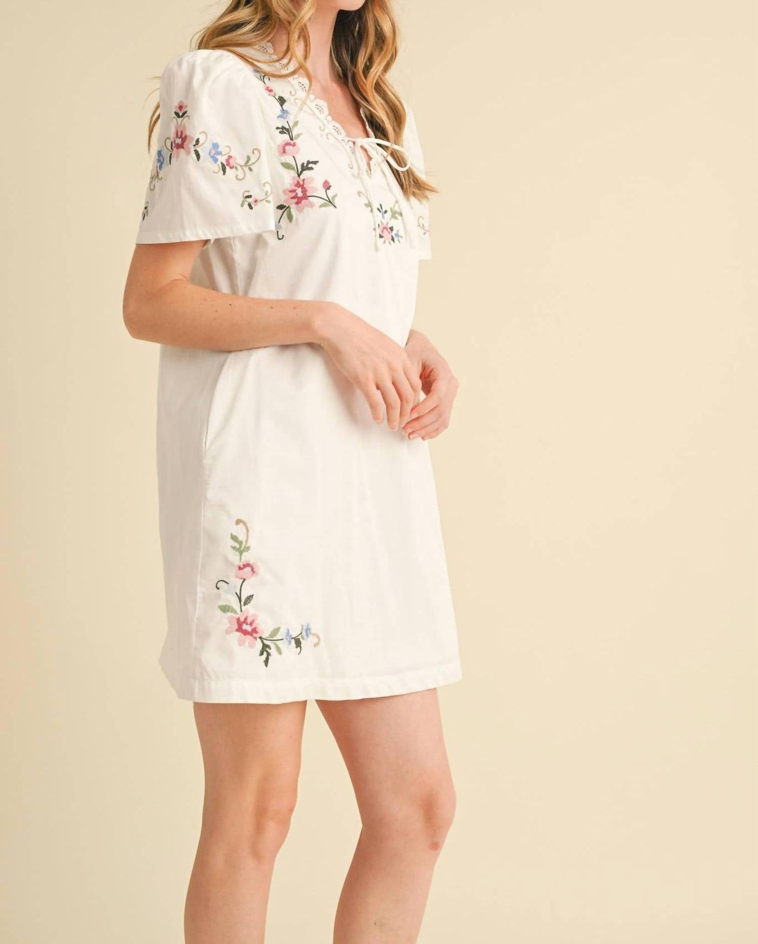 The kind of easy and flattering dress you'll be reaching for all season long. Elevate your summer wardrobe with the Daphne Shift Dress by &merci, a charming piece in elegant floral embroidery. Flaunting short sleeves and a chic V-neckline enhanced with lace trim and a tying detail, this mini dress showcases intricate floral embroidery along the neckline, shoulders, and hem. Featuring a relaxed shift silhouette and convenient pockets, the dress is easy to slip on with its pull-on design. Perfect for evening events, this boho chic mini dress embodies effortless style for warm weather occasions.