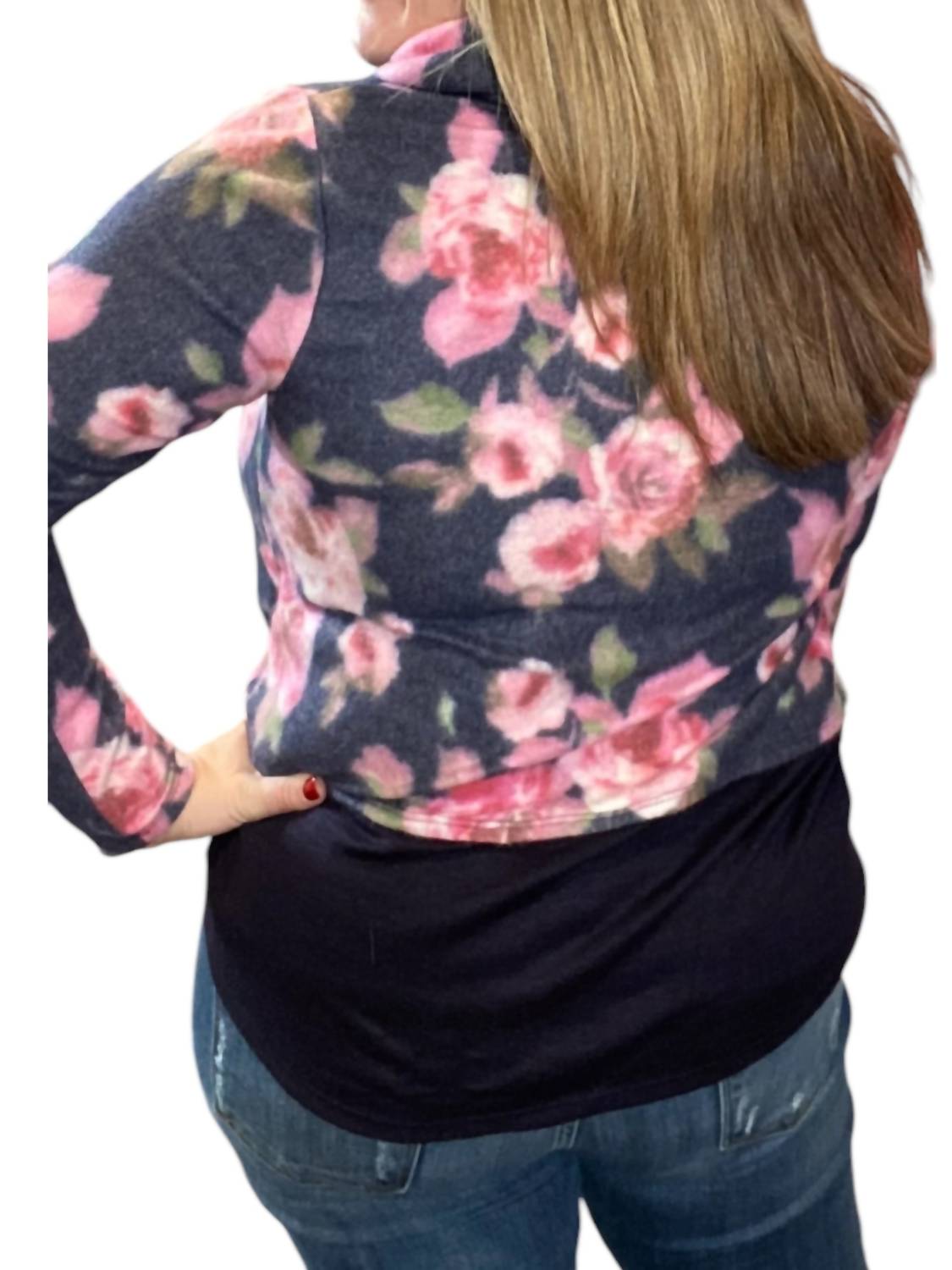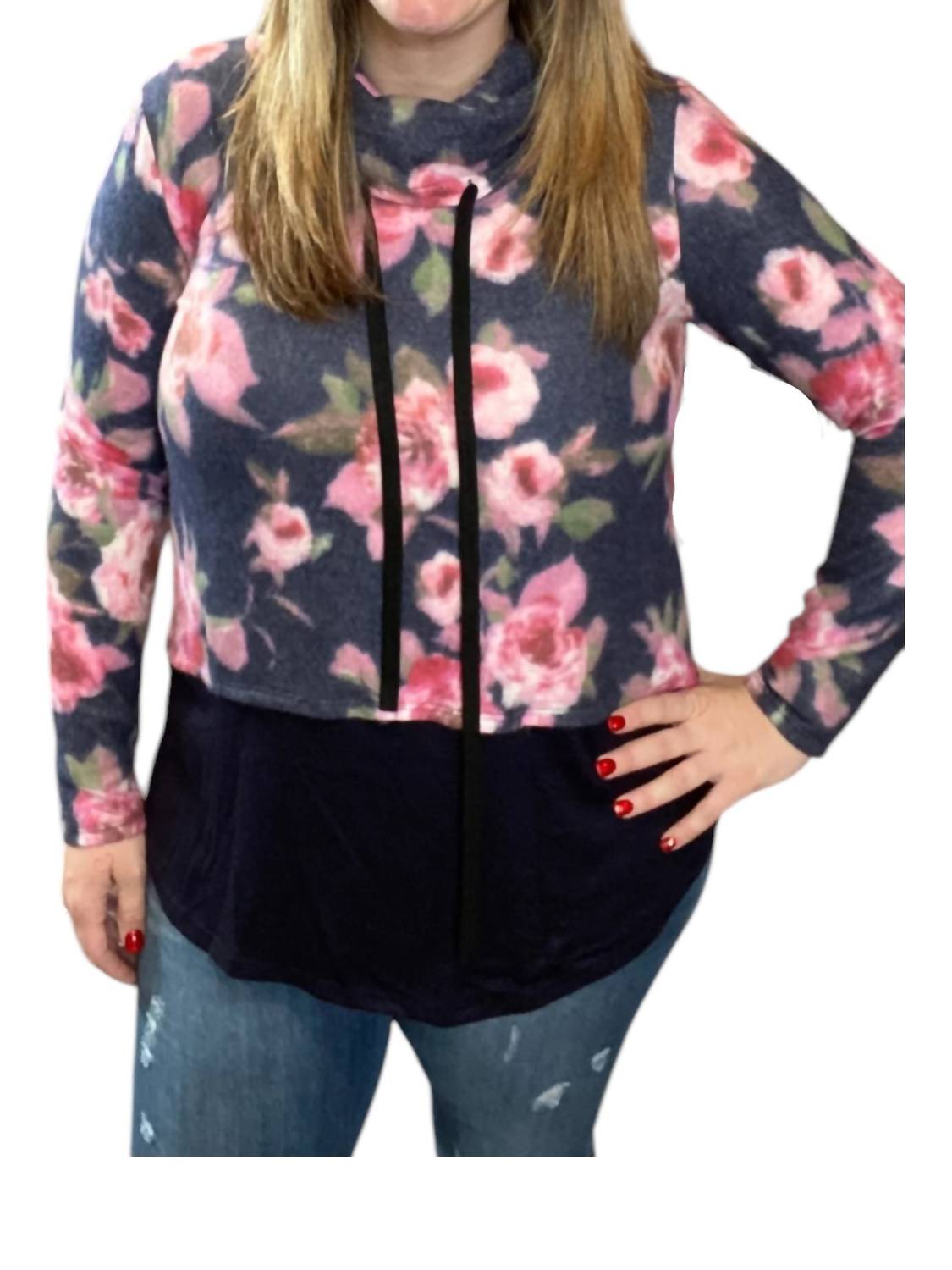 Attached hood with drawstring. Floral print. Pullover style. True to size. 78% Polyester 18% Rayon 4% Spandex. Machine wash cold.