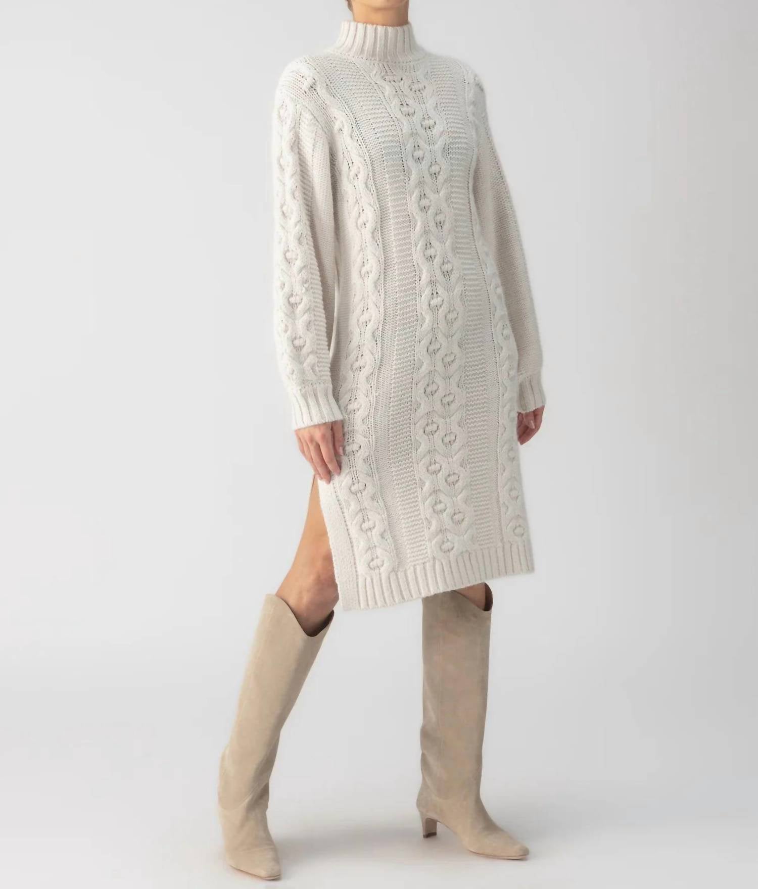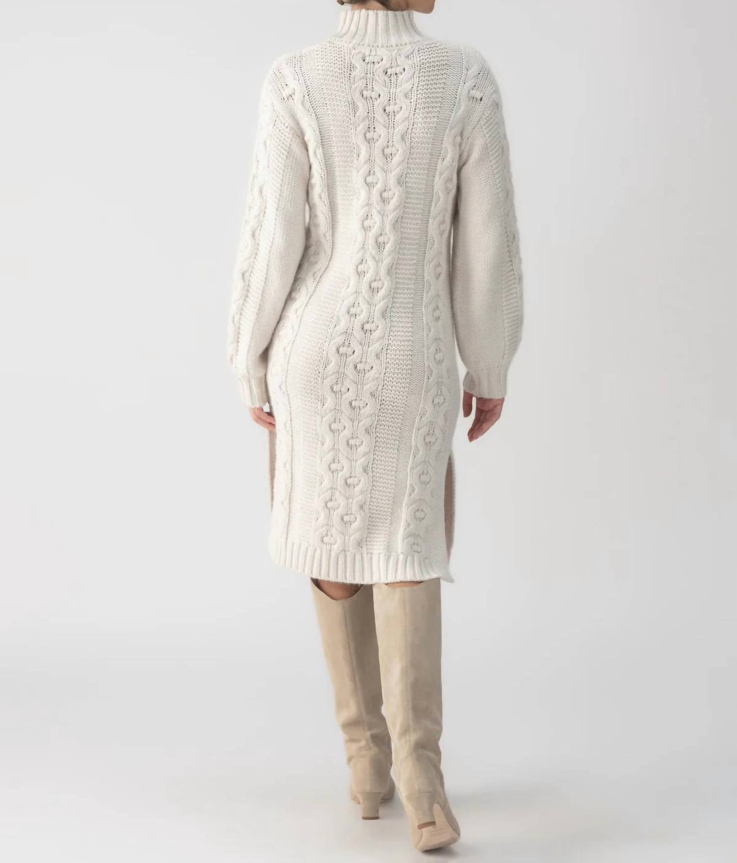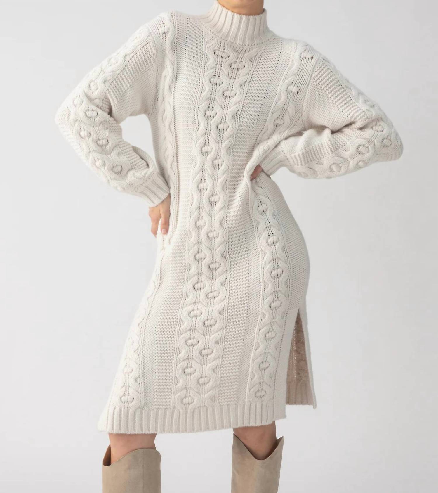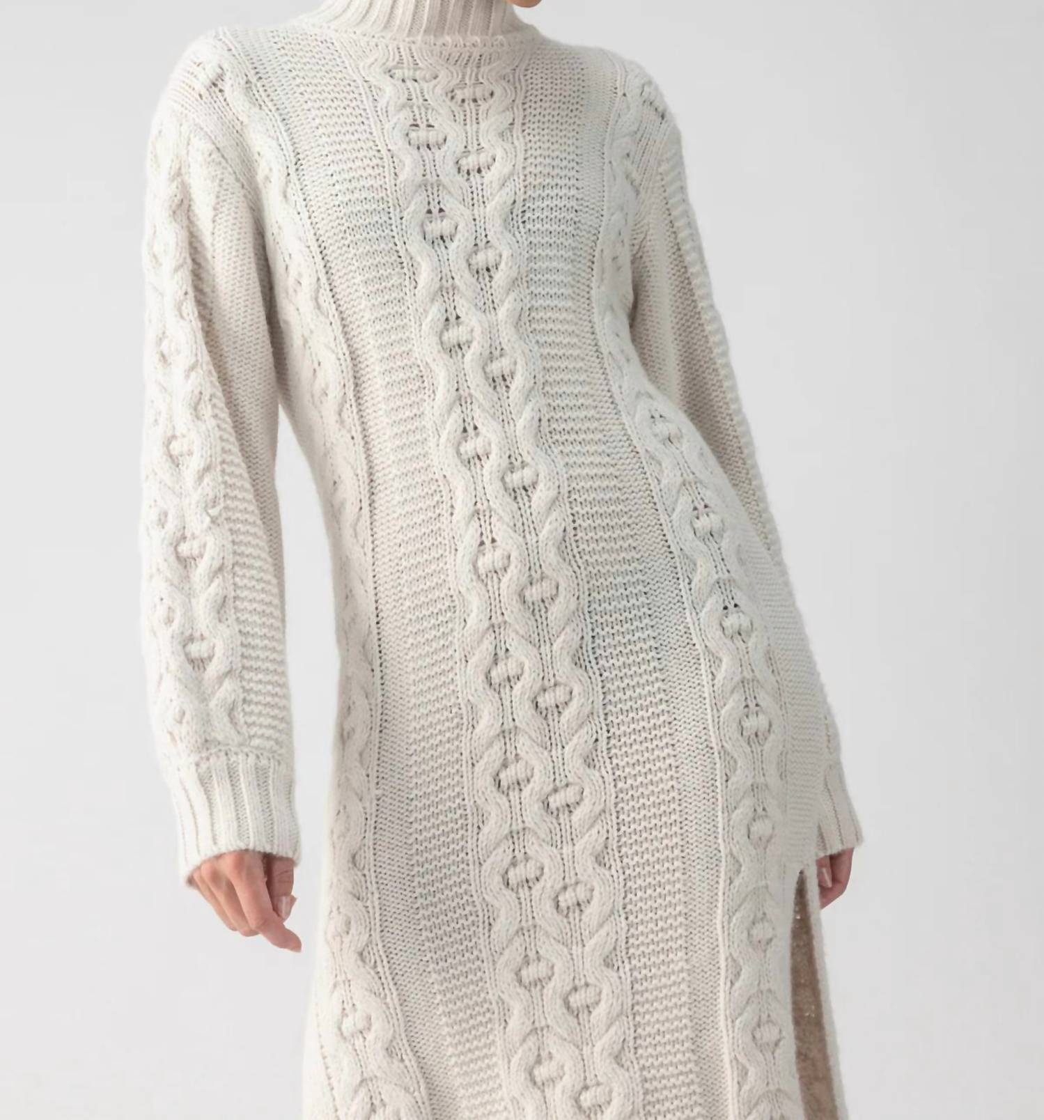 The perfect length dress does exist. Embrace effortless style with the Sanctuary Cable Knit Side Slit Sweater Dress, perfect for the minimalist trend. This midi dress in a chalk color features long sleeves and a ribbed mock neckline with ribbed cuffs, crafted from acrylic for medium weight warmth. The relaxed fit and side slit add a contemporary touch, while the pull-on closure ensures easy wear. Care for with machine wash for convenience. Model is 5'8" and is wearing a size S with measurements: front length 41", bust 37", sleeve 31".