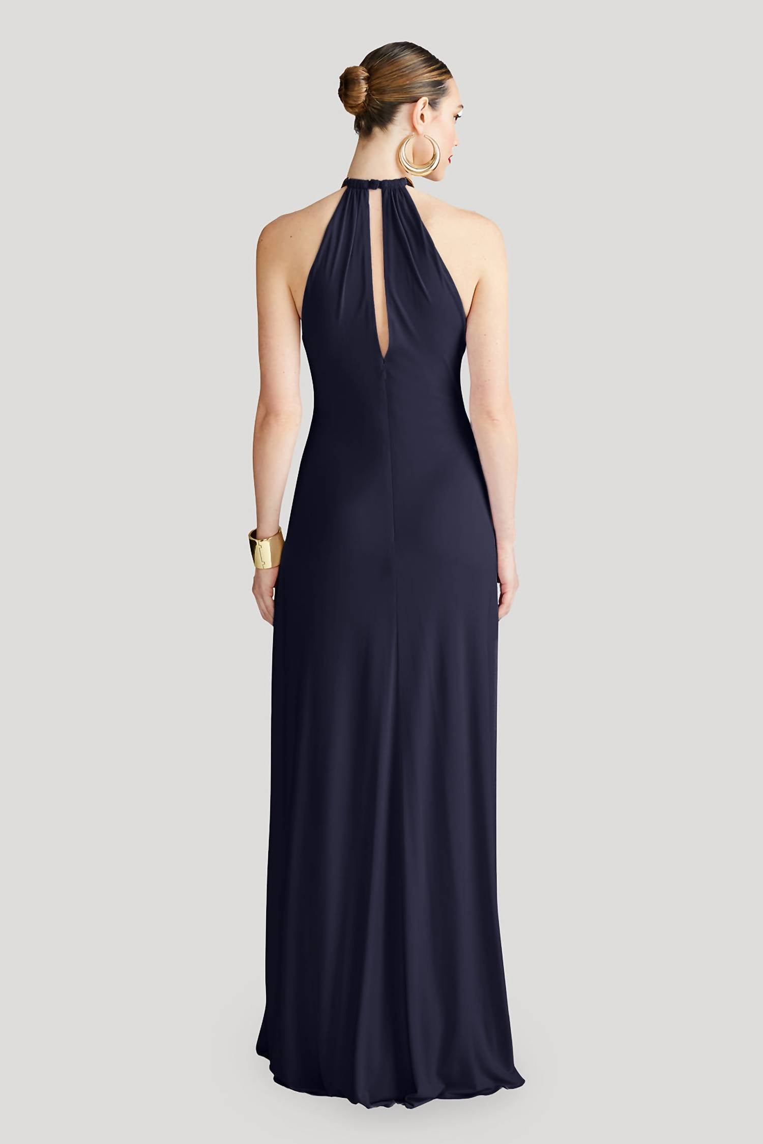 A maxi dress that is just as cute as it is comfortable. Elevate your vacation wardrobe with the HALSTON HERITAGE Women's Oriana Gown, a stunning sleeveless navy maxi dress crafted for the minimalist at heart. Featuring a fit and flare silhouette, this solid gown is designed with a sophisticated halter neckline, perfect for springtime occasions. The pull-on closure offers easy wearing convenience. Care instructions are not available.
