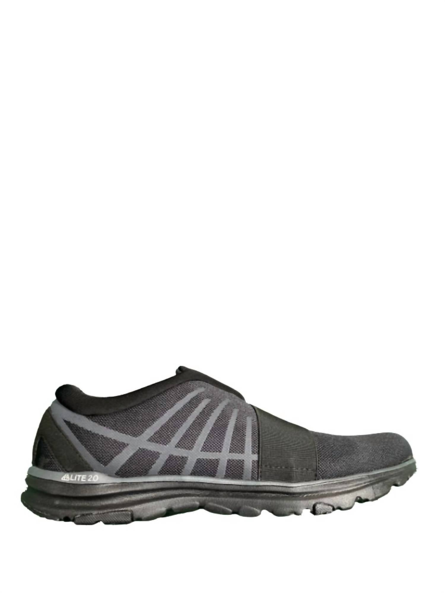 Stylish, comfortable and supportive. These athletic sneakers check all of the boxes. A single black slip-on shoe. Athletic design with a sleek, low-profile silhouette. It features a breathable mesh upper with crisscrossing lines in a lighter gray color.