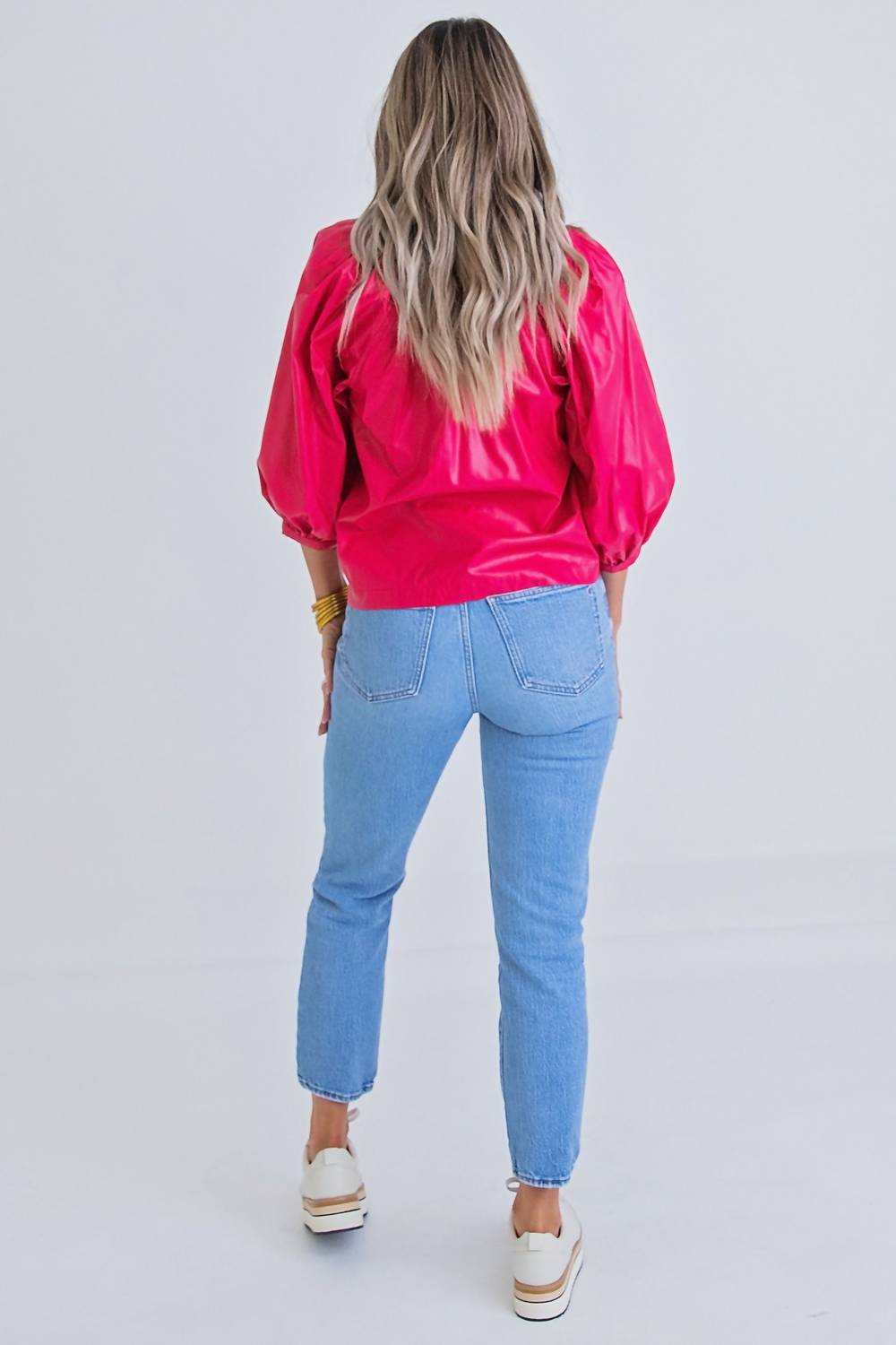 A timeless blouse that will never go out of style. Introducing the Cranberry Pleather Button Top by Karlie, a stylish addition to your fall wardrobe in a striking pink hue. This women's blouse features elbow-length sleeves and a flattering V-neck, crafted from smooth polyester for a sleek, solid look. The button closure adds a classic touch to this closet staple. Care instructions are not provided, so please handle with care to maintain its vibrant appeal.