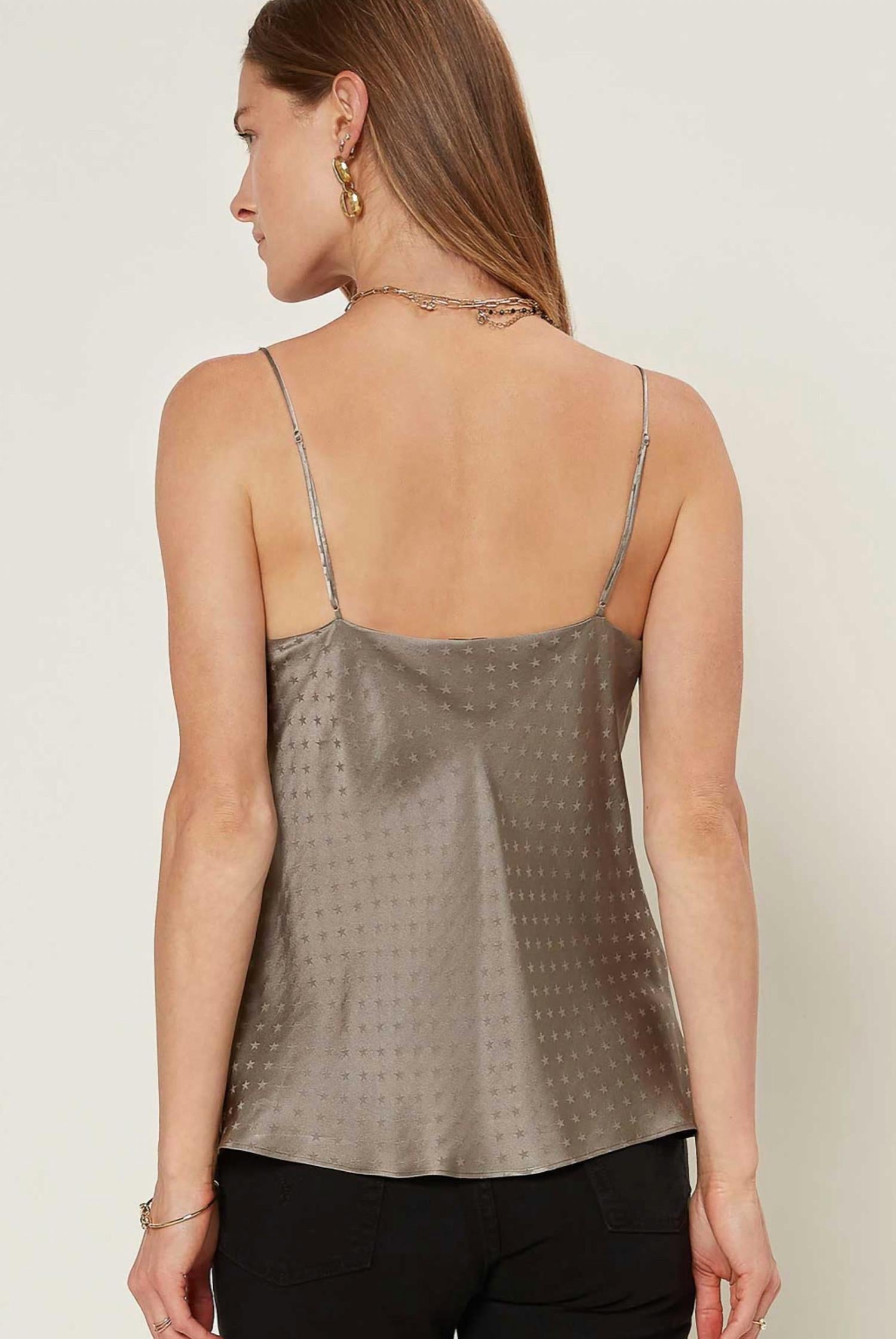 Taupe silk camisole. Tonal star print. Adjustable straps. Split hem. Softly draped cowl neckline. Teeny spaghetti straps. Minimalist in style, maximum allure. Adjustable shoulder straps. 100% Silk. Dry clean.