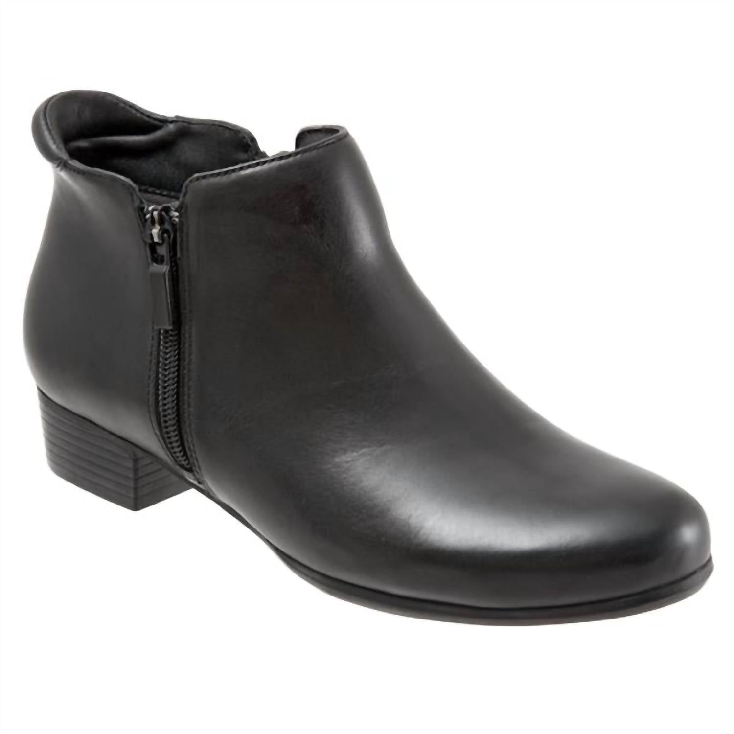 Say hello to the perfect, most versatile boot. The ankle height makes this style easily transition from day to night. Wear them with your favorite skinny jeans and tee for a more laid back look, or pair them with your favorite mini dress and jacket for a night out on the town. Step out in style with these women's ankle boots, a sleek and versatile addition to any wardrobe. Designed for the modern woman, they perfectly balance fashion and comfort for any occasion. Crafted with attention to detail, these boots feature a leather upper, soft lined and cushioned insole with a removable footbed, and a lightweight, flexible rubberized sole. The zipper ensures easy wear, while the tricot fabric lining adds breathability.