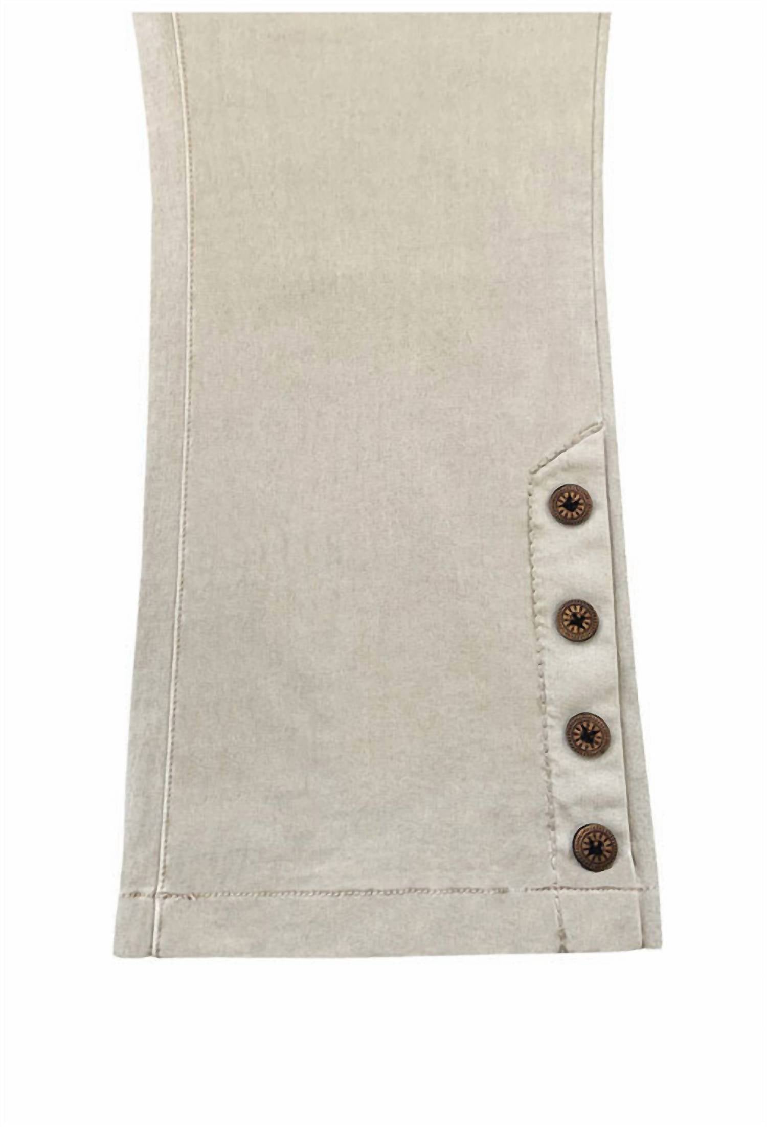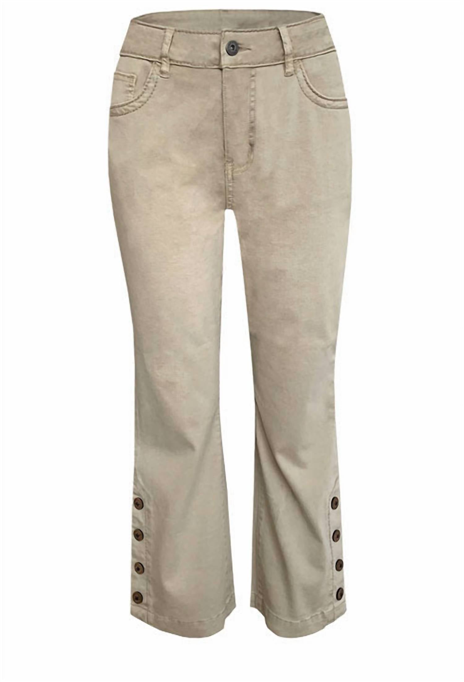 Everyone needs a good pair of skinny pants and this is a style you'll keep reaching for no matter the season. Elevate your wardrobe with Ethyl's Women's Flare Capri Pants With Buttons, a versatile tan pair crafted for any season. Featuring a slim fit and flared leg style, these capris boast a comfortable mid-rise and an inseam of 24 inches. Composed of a cotton blend with 85% cotton, 12% polyester, and 3% spandex, they include a stretch quality for added comfort. Closure: Front zip fly. Care: Machine wash cold.