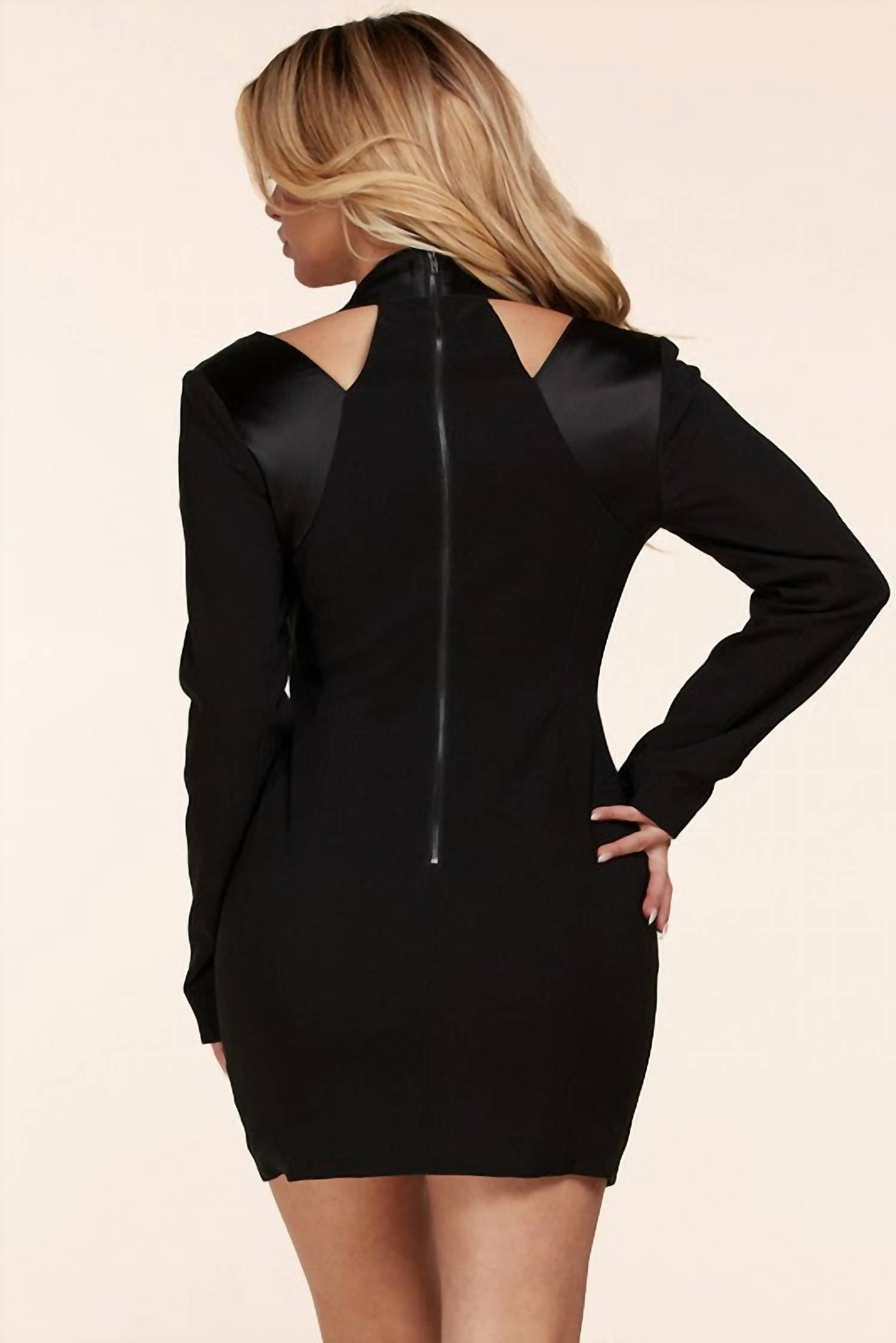 Discover the allure of the Front Cut Out Bodycon Mini Dress by L'ATISTE in classic black, an elegant choice for your wardrobe. With long sleeves and a v-neckline, this dress is a stylish blend of sophistication and sultry design. It features a back zip closure for ease of wear, accentuated by a bustier style and eye-catching contrast tuxedo detailing. Made from a luxe blend, the dress is composed of 90% Polyester, 10% Spandex with a full polyester lining, offering a flattering fit. Designed for a close-to-the-body silhouette, it measures 33” in length, making it the perfect mini choice for any occasion.