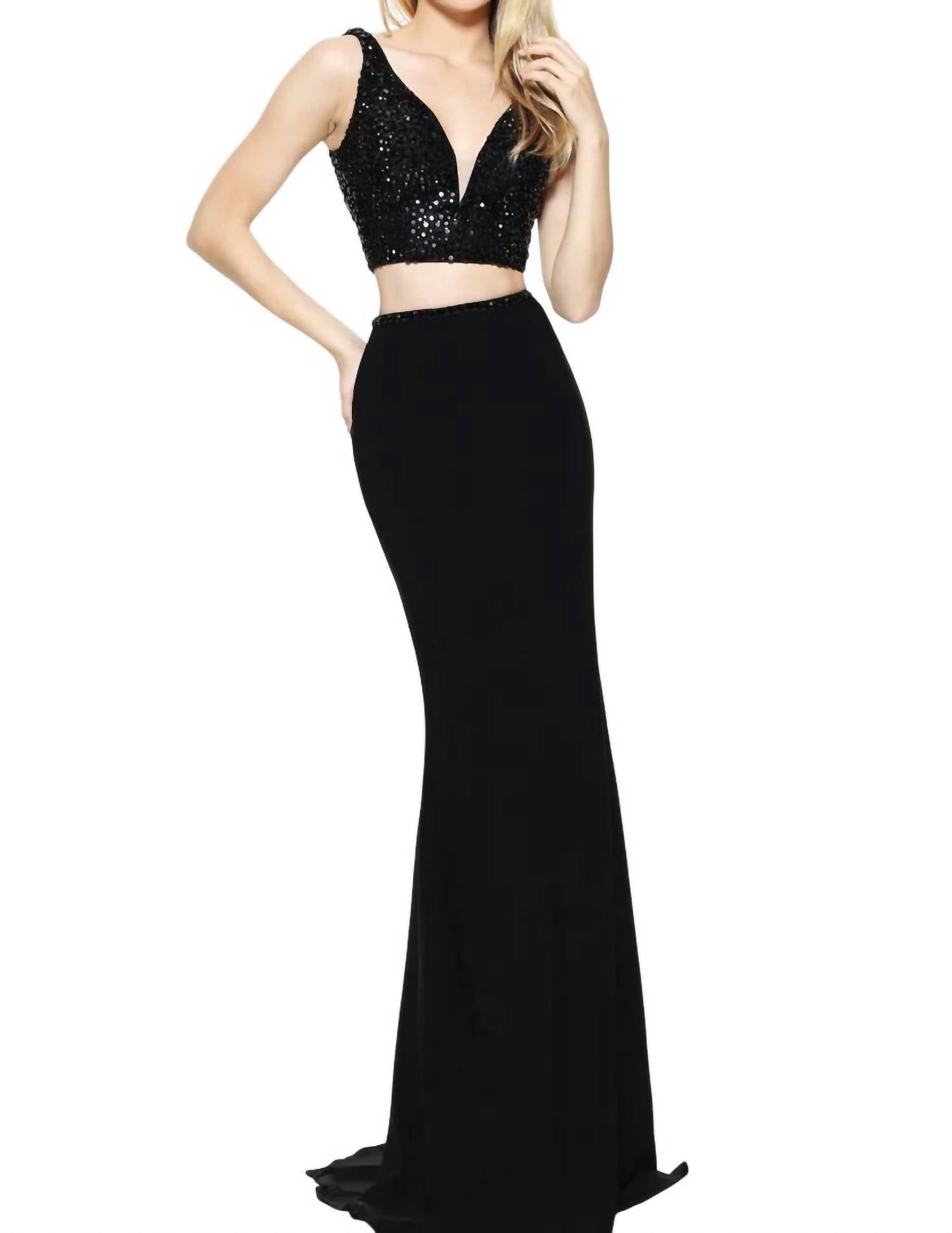 Features a fitted jersey. Halter top. High-Neckline. Sheer lace waist panel. Skirt with slit. Full-length.