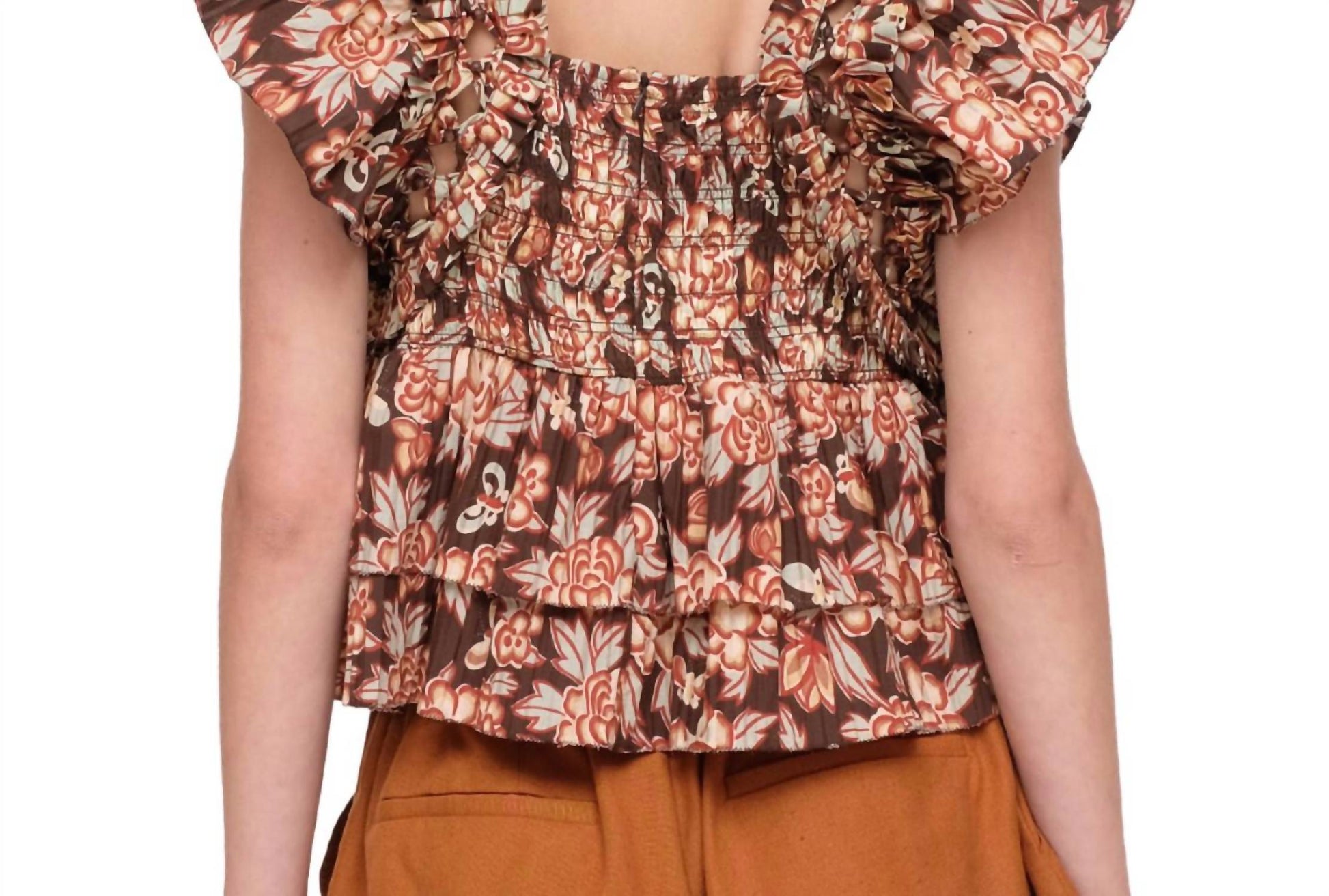 This floral print top features subtle cutouts at the shoulders adorned with beaded accents, adding a delicate touch to its design. With short flutter sleeves and ruffled edges, it exudes a playful yet feminine vibe. The smocked detailing ensures a comfortable fit, while the tiered hem enhances the overall flow of the garment. A square neckline completes the look, making it perfect for both casual outings and dressier occasions. Made from 100% cotton, it is soft and breathable. The model is 5'10'' and is wearing a size small. Machine wash cold for easy care, and it fits true to size.
