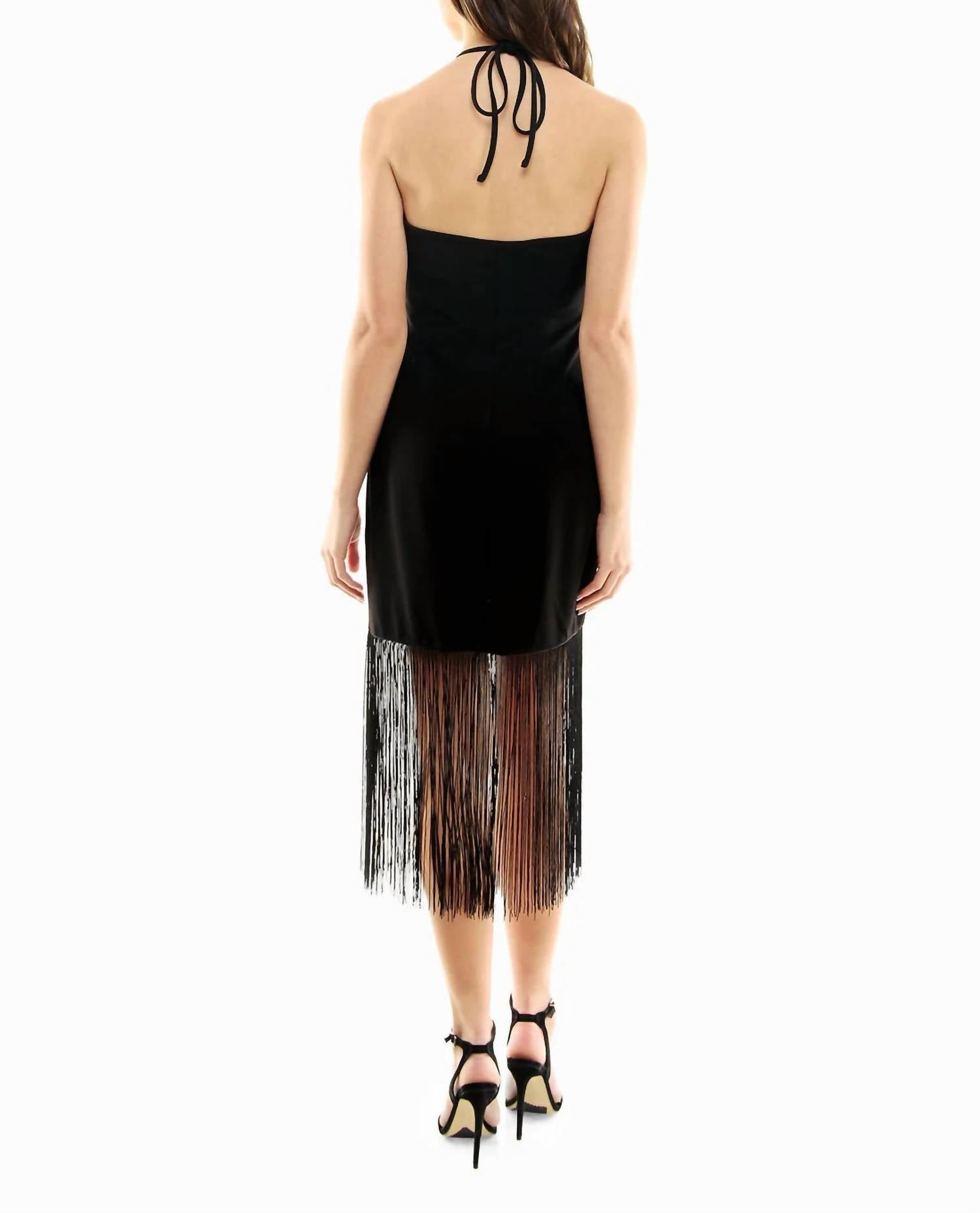 This Dress is a sheath style made from 95% polyester and 5% spandex, featuring a halter neck and midi length. It includes a fringed details, and spaghetti straps. Features a tie closure. Hand wash cold inside out.