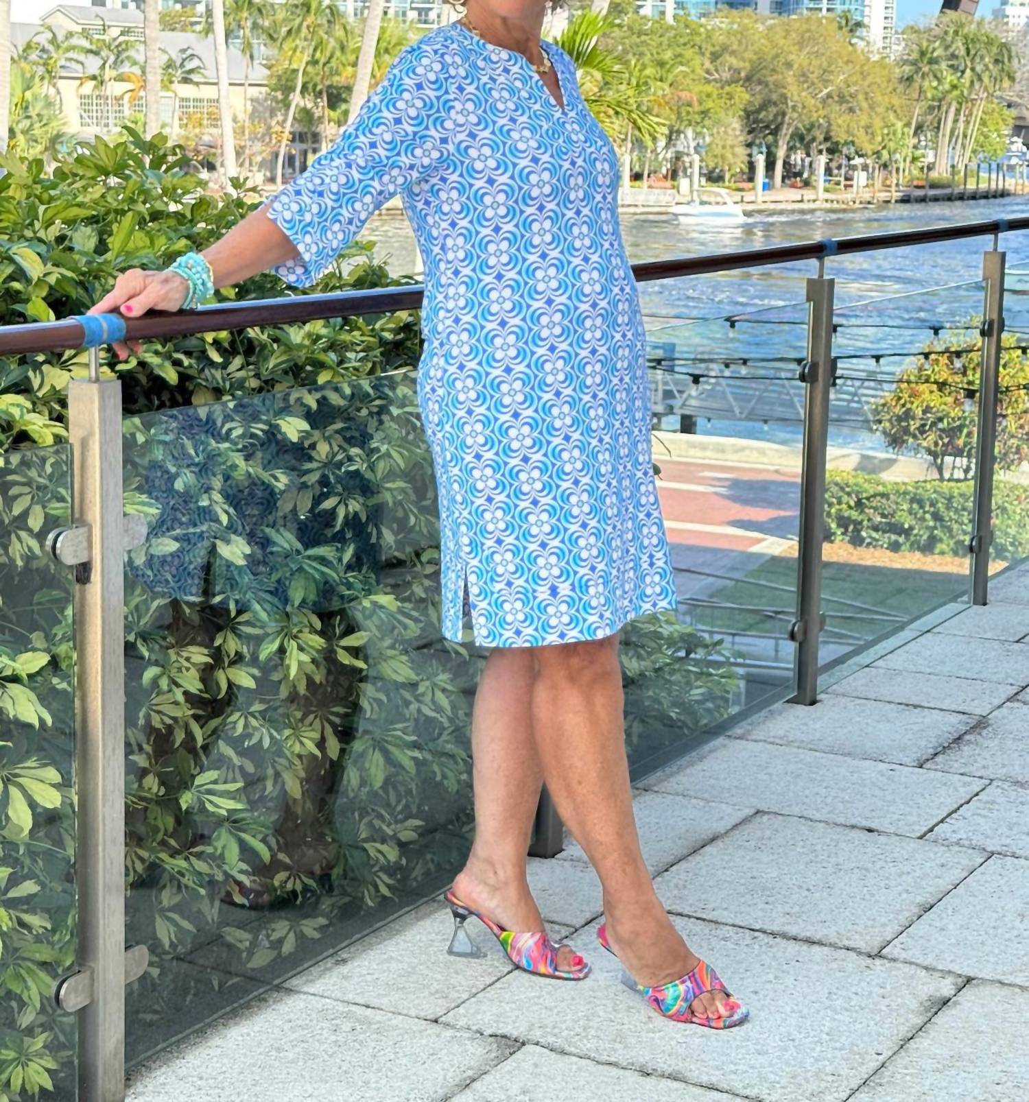 The kind of easy and flattering dress you'll be reaching for all season long. Introducing the Lulu-B 3/4 Sleeve Split Dress, a vibrant turquoise piece with a charming flower pattern designed for a boho chic style. This mini shift dress features a slit V-neck and three-quarter split sleeves for a playful look. Made with a blend of 92% nylon and 8% spandex, it offers both comfort and a cooling element. Closure: Pull on. Perfect for a New Year's Eve dinner party, this dress is versatile and on-trend.