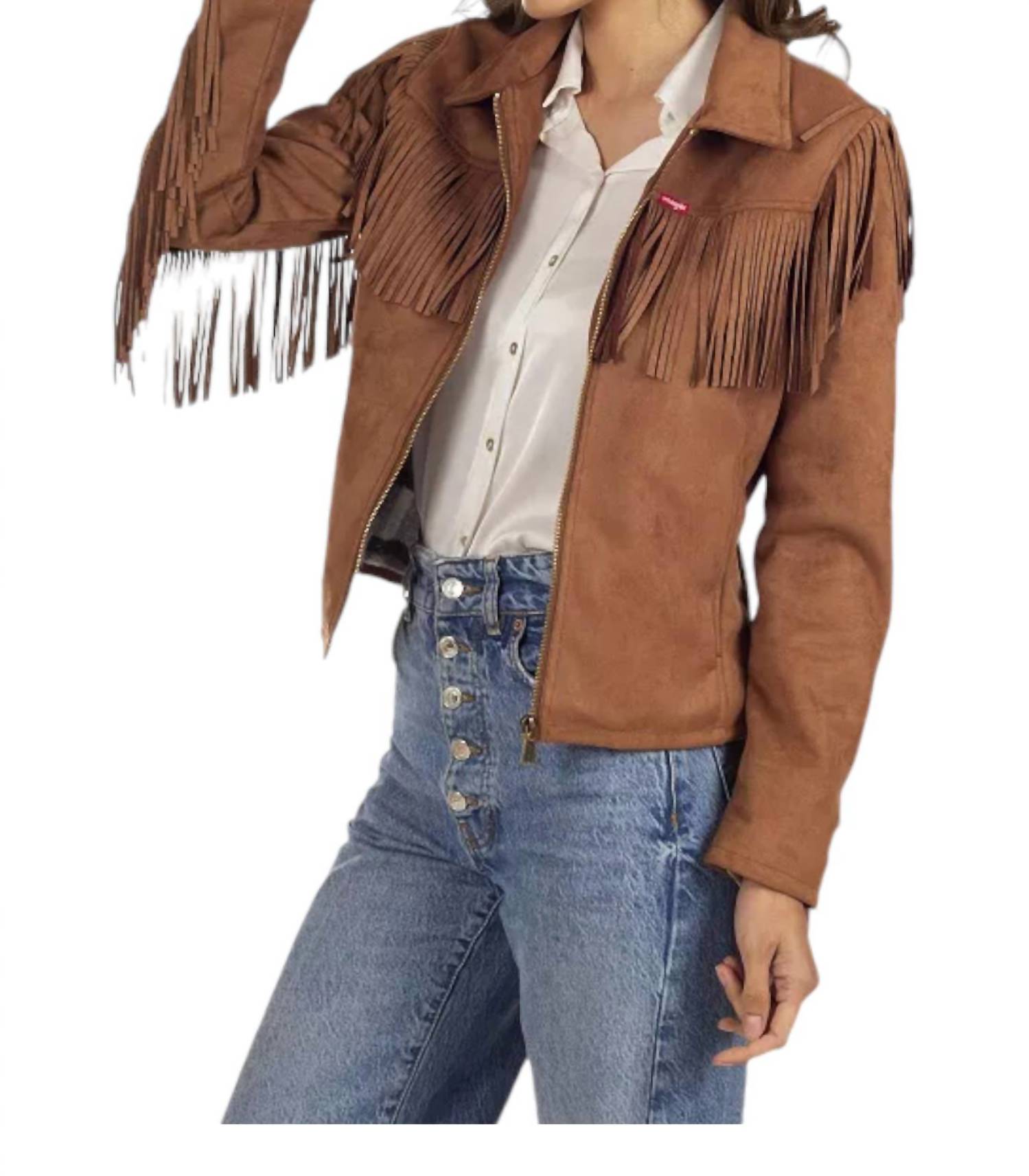 Faux-leather construction. Fringe trim. Zipper front. Long sleeves. Lightweight. Lined. 100% Polyurethane. Dry clean. Imported.