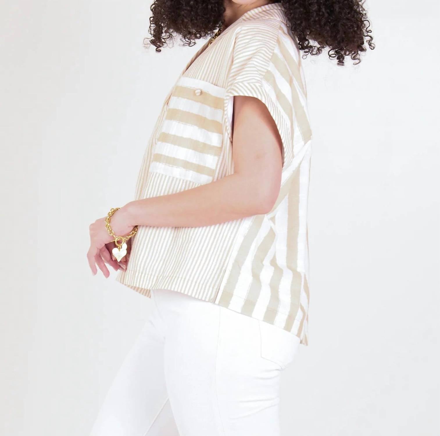 A versatile blouse that works from desk to dinner! Upgrade your wardrobe with the Luna Top by Emily McCarthy, showcasing a fashionable sand stripe pattern perfect for spring gatherings. This short sleeve blouse is crafted from comfortable cotton and features a classic collar, providing a refined and versatile look suitable for both casual and holiday party settings. Designed with a button closure and functional pockets, it combines practicality with trendy minimalist style. For care, simply machine wash and line dry to maintain its understated elegance.