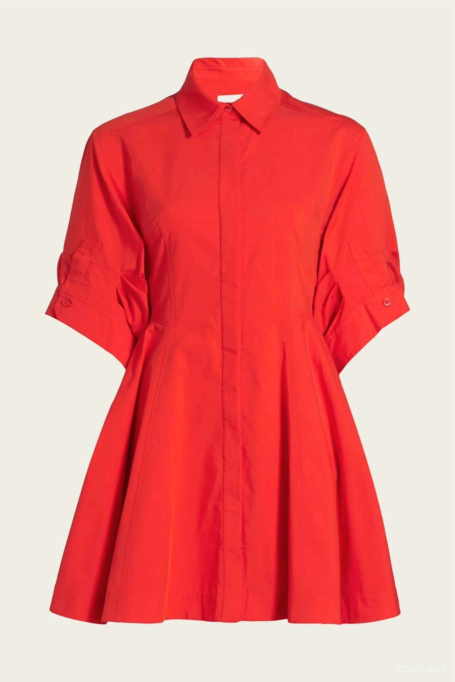 The perfect mini dress for those warmer months. Introducing the Jazzie Short Sleeve Dress by SIMKHAI, a vibrant addition to your wardrobe in Fiery Red. This dress features elbow-length puff sleeves with button cuffs and a mini length measuring 32 inches from the shoulder. Made from a cotton blend of 63% cotton and 37% polyester, it boasts a lightweight, non-stretch poplin fabric and is fully lined with 100% cotton. Designed with a collared neck and covered button placket, it offers on-seam side pockets for added convenience. Imported from China and crafted with care, this dress requires dry cleaning to maintain its pristine look.