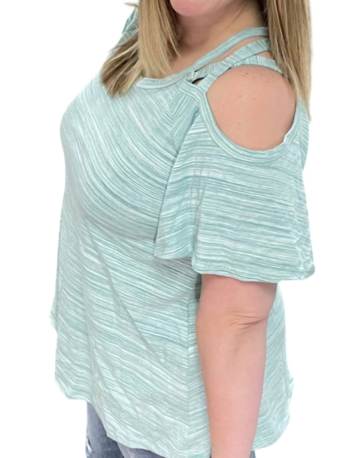 Scoop neckline. Shoulder cut out. Relaxed fit. 48% Cotton 33% Polyester 15% Rayon 4% Spandex. Machine wash cold.