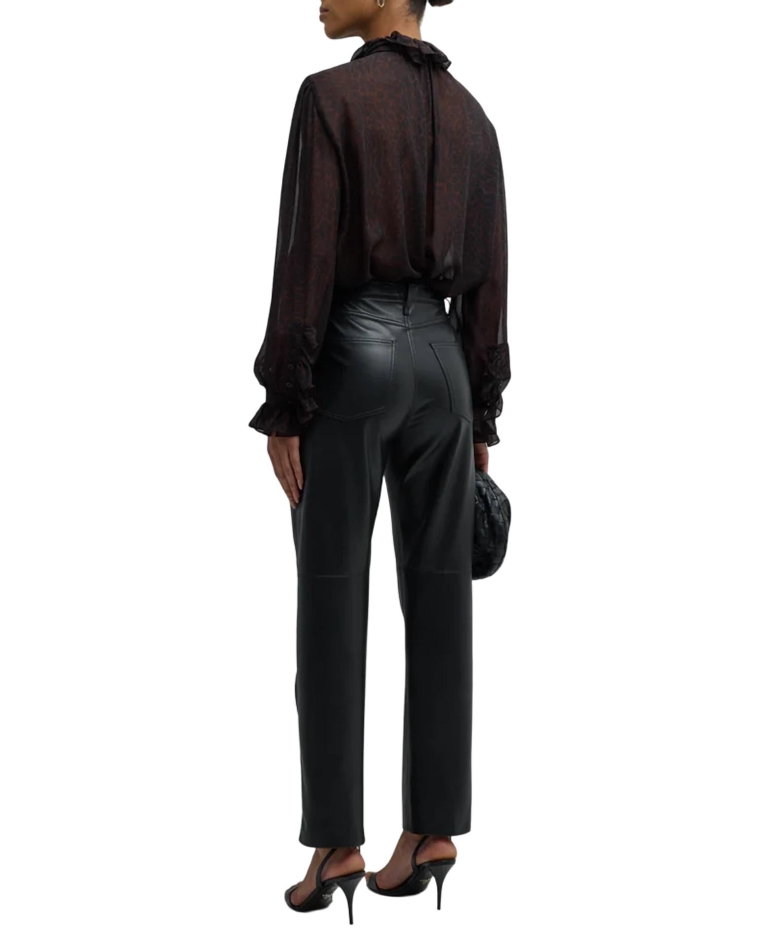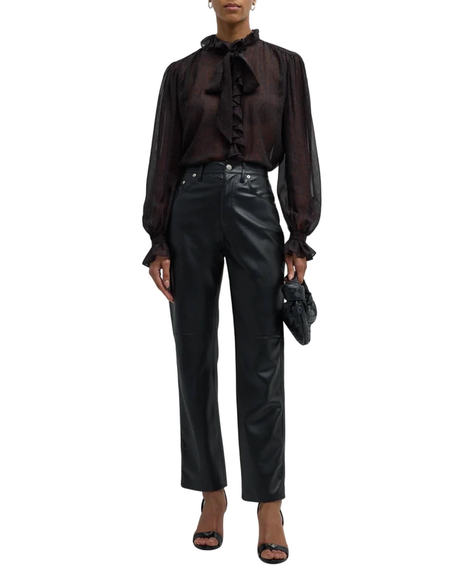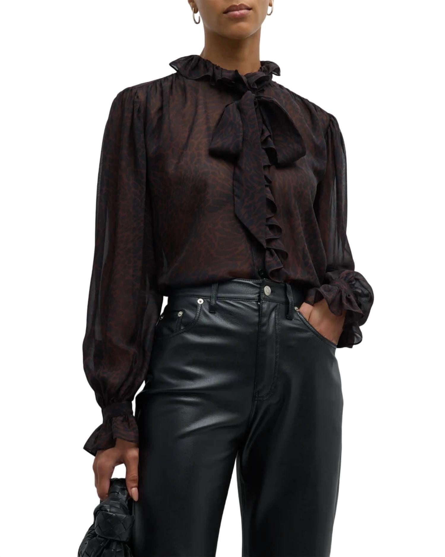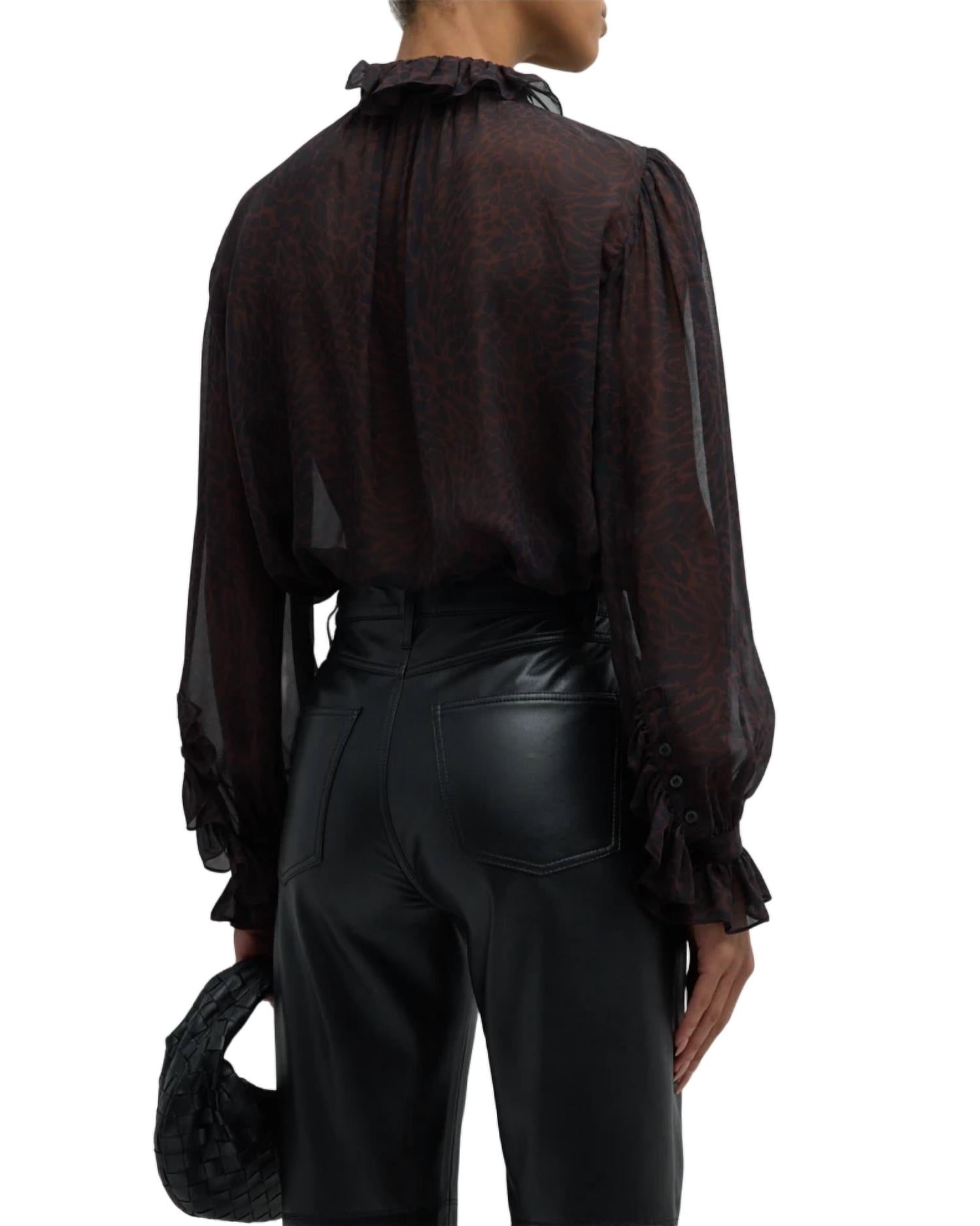 Featuring a ruffled front in an allover animal print. Ruffle collar and self-tie. Long sleeves with ruffled cuffs. Loose silhouette. Hem sits at the hip. Fabric: 100% Silk. Dry clean.