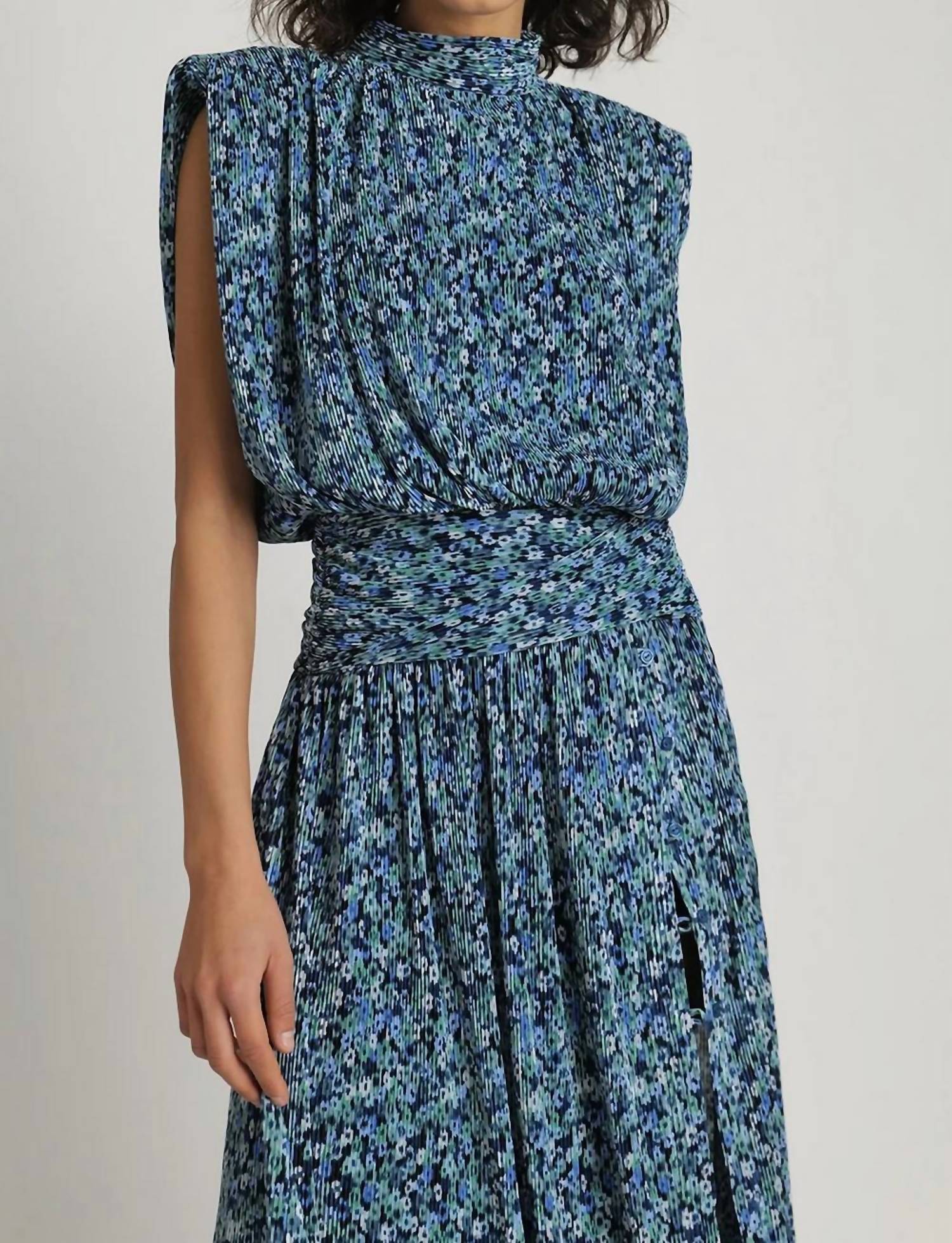 Style this maxi with your favorite statement necklace and sandals for the perfect look. Unveiling the Solange Flora Pleated Maxi Dress by SABINA MUSAYEV, crafted for the bold maximalist in a vibrant turquoise print. This polyester piece features a sleeveless design with shoulder pads and a distinctive mockneck, enhancing its unique charm. Designed with an elastic waistline and a front slit, this kaftan silhouette accentuates a woman's figure while offering effortless elegance.