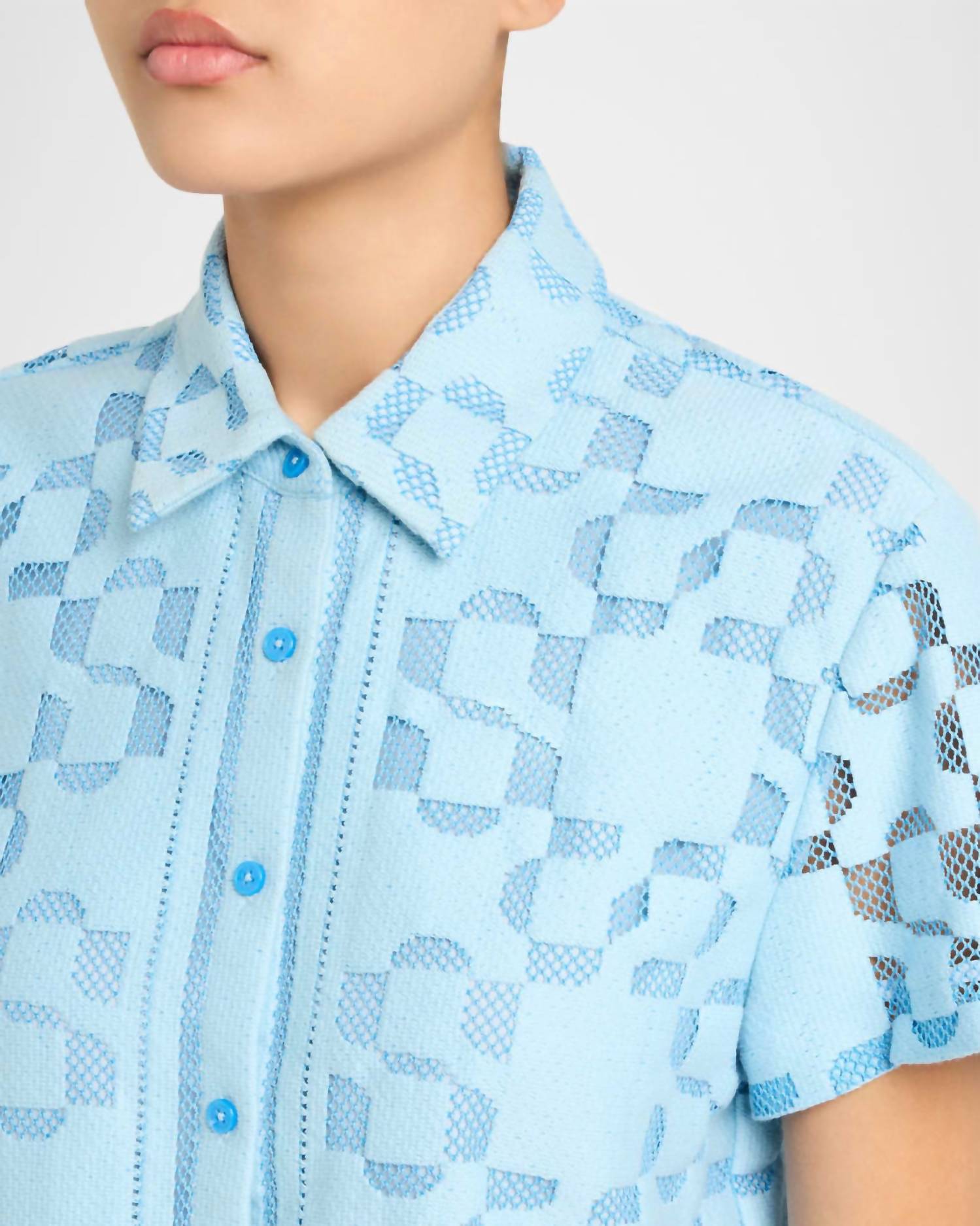 Perfectly tailored and soft to the touch. Embrace boho chic style with the Simkhai Makaia Cropped Button Down Shirt in Azure Sky Multi, perfect for your summer adventures. This women's short sleeve shirt boasts a boxy silhouette crafted from an 80% cotton, 20% polyamide blend, offering breathable comfort. Featuring a classic collar neckline and button closure, this patterned shirt is an ideal choice for vacation wear. Originating without pockets for a sleek look, remember to dry clean this wardrobe essential to maintain its vibrant appeal.