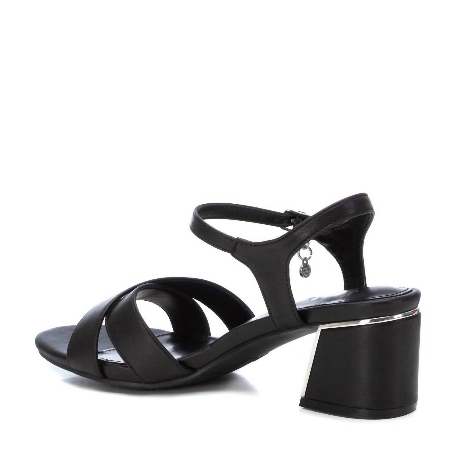 Classicly cute and all-day-wearable. We love this sandal. Elevate your ensemble with Xti's Women's High Heeled Sandals, expertly designed to combine chic style and everyday comfort. Crafted from black faux leather and featuring a unique metallic detail on the heel, these sandals add a sophisticated edge to any outfit. They boast a sturdy block heel, measuring a comfortable 6 cm, complemented by a round toe and a non-slip rubber sole. The buckle closure ensures a secure fit, while their PETA-certified vegan construction underscores a commitment to ethical fashion.