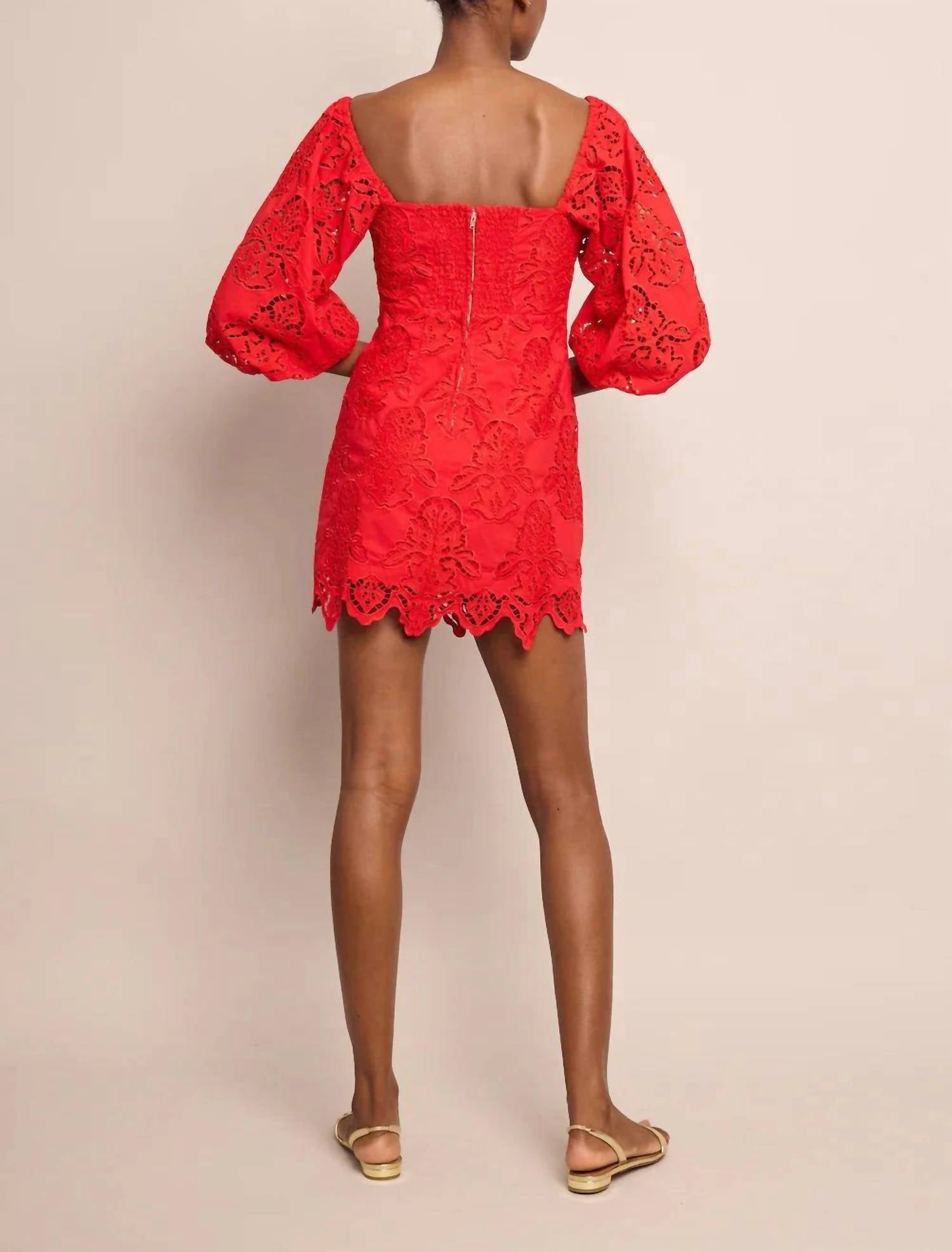 Comfortable and cute, this casual day dress has it all. The Montauk Embroidered Eyelet Mini Dress by Cara Cara is a striking addition to any wardrobe, perfect for a variety of occasions in vibrant red. This cotton dress features three-quarter blouson sleeves and a sophisticated square neckline for a chic and fitted look. Enhanced with a back body smocking panel for comfort, the dress includes decorative scallop hem detailing and placed eyelet design. Closure: Center back zipper with hook and eye. Care: Dry clean only or hand wash cold.