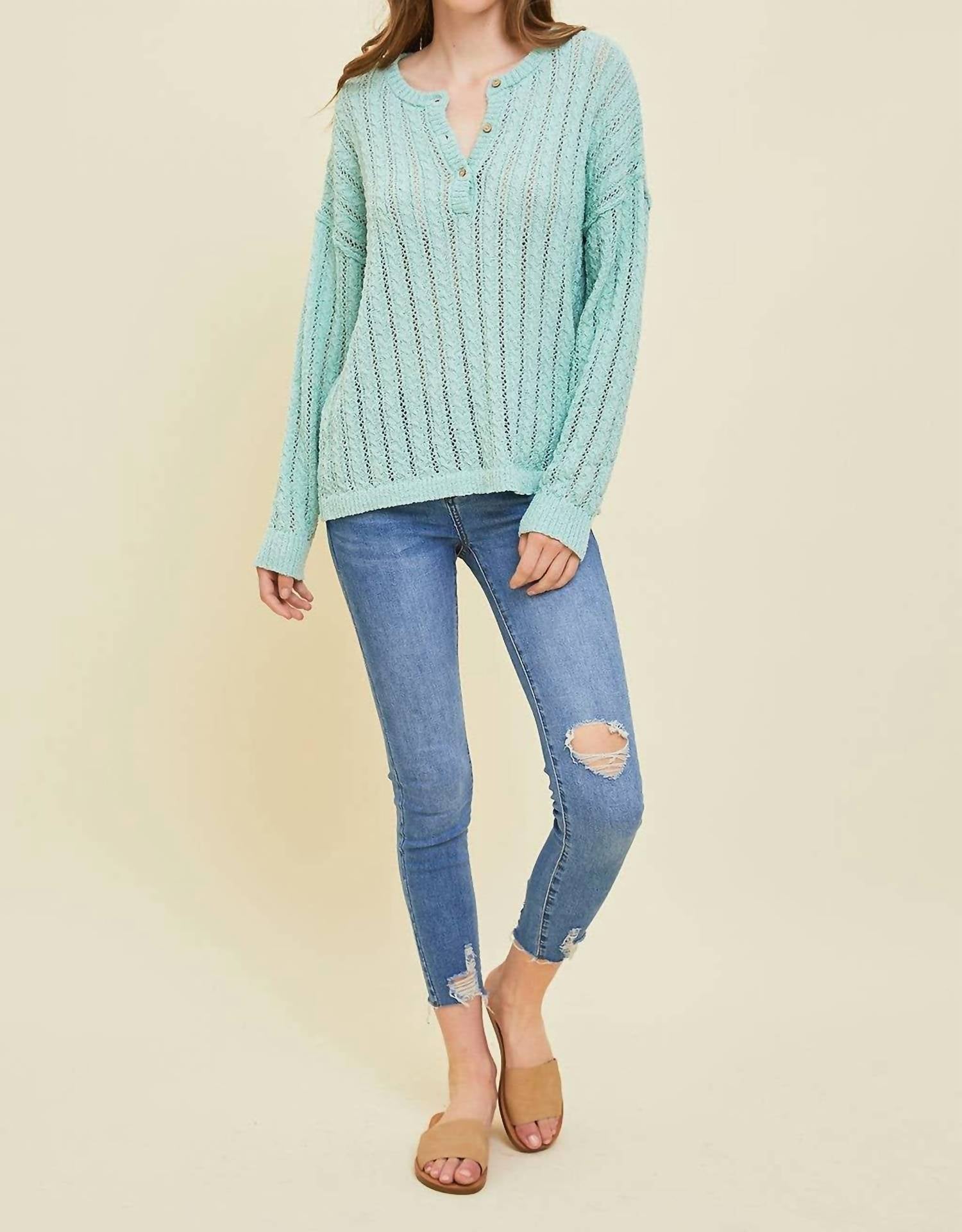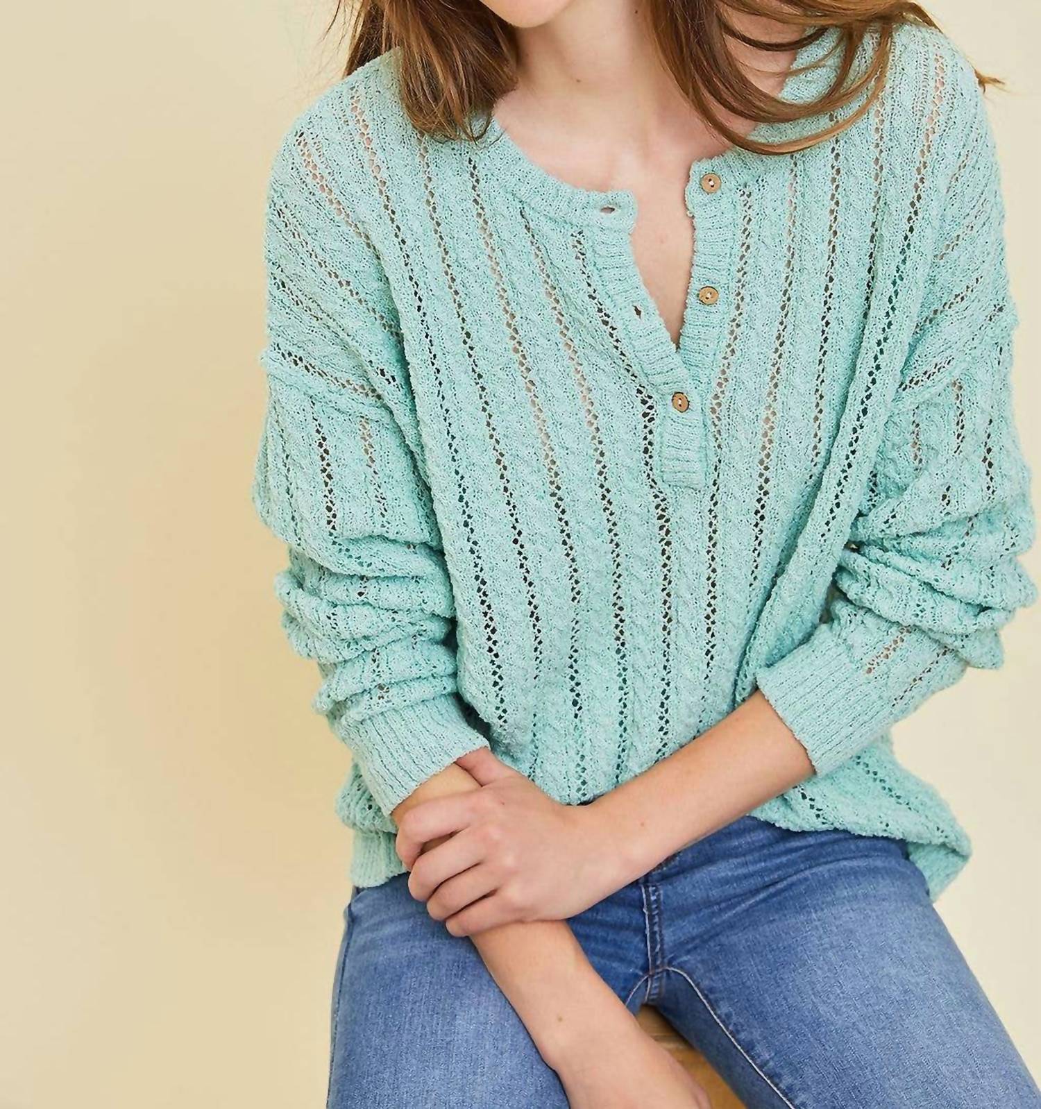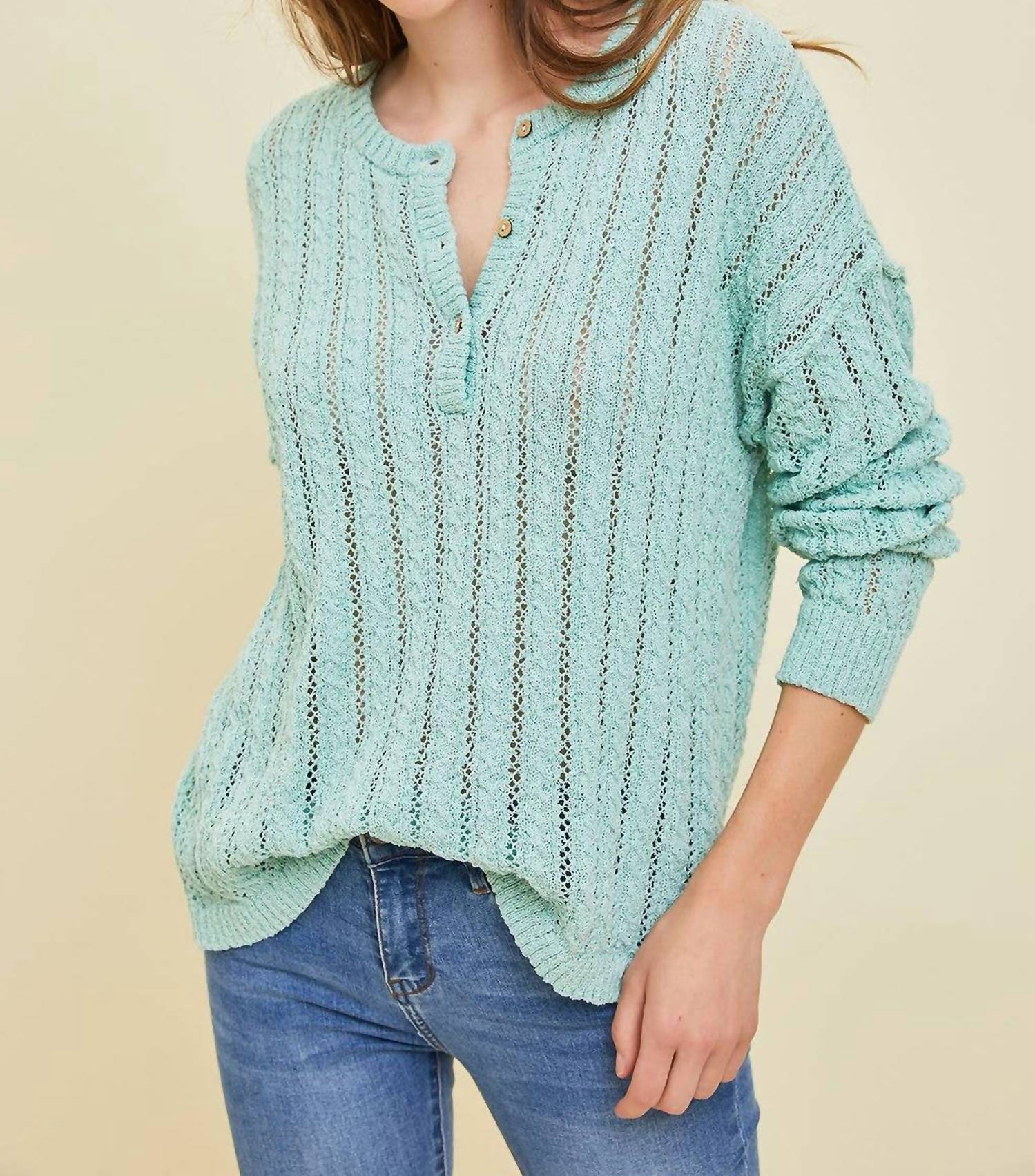 The ultimate go-to sweater, expertly crafted to provide the perfect combination of warmth and style. Its classic design and soft fabric make it a must-have addition to your wardrobe. Introducing the Open Knit Front Button Sweater by Heyson, a chic and comfortable addition to your wardrobe. Crafted with a textured polyester material, the sweater features long sleeves and a stylish V-neck design. Perfect for spring, this mint green sweater is ideal for holiday parties, including Thanksgiving. Closure: Button closure. Care: Hand wash, line dry.