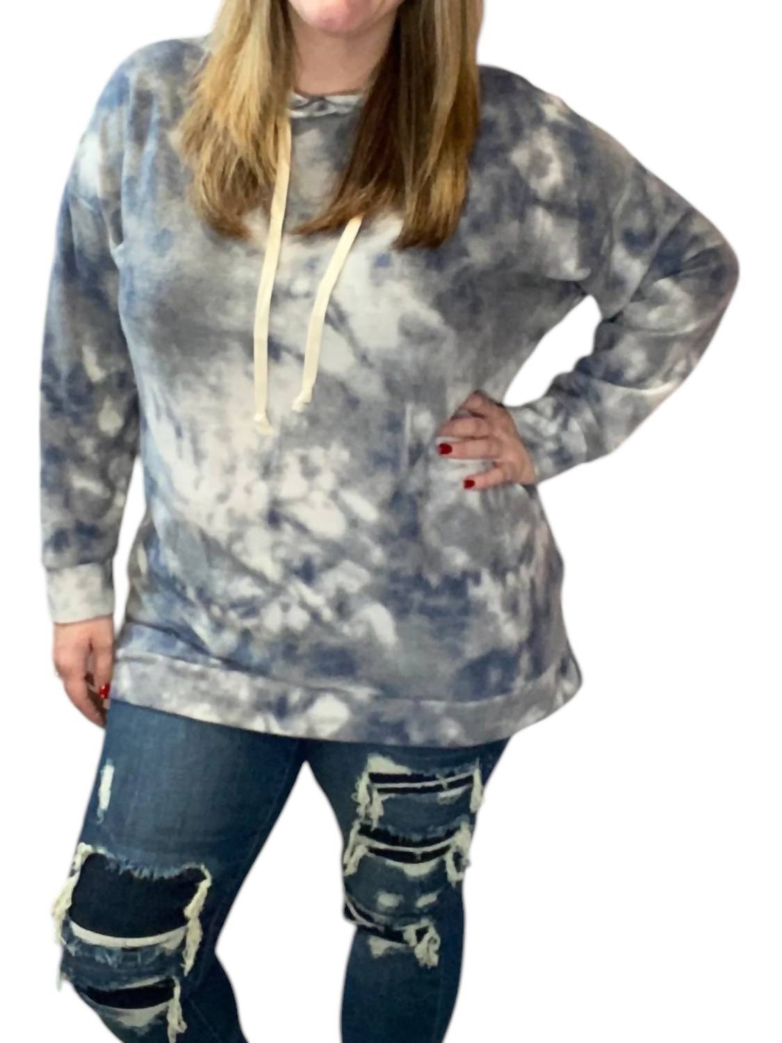 Pullover style. Attached hood with drawstring. Tie dye. Long sleeves. True to size. 78% Polyester 18% Rayon 4% Spandex.