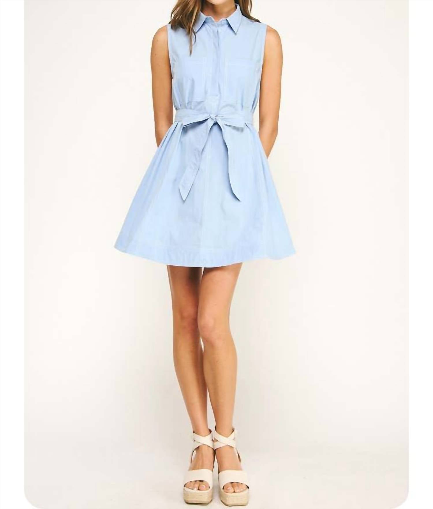 The perfect mini dress for those warmer months. Discover the Contrast Top Stitch Mini Shirt Dress by LIV, perfect for making a chic statement this spring. Crafted in a sleek blue, minimalist design using a 65% Rayon and 35% Nylon cotton blend poplin, this sleeveless baby doll style offers full lining comfort. The dress features a spread collar, button closure, and functional side and front chest pockets, complete with a removable sash tie belt to accentuate the waist. Care for this stylish piece is simple with machine washing instructions provided.