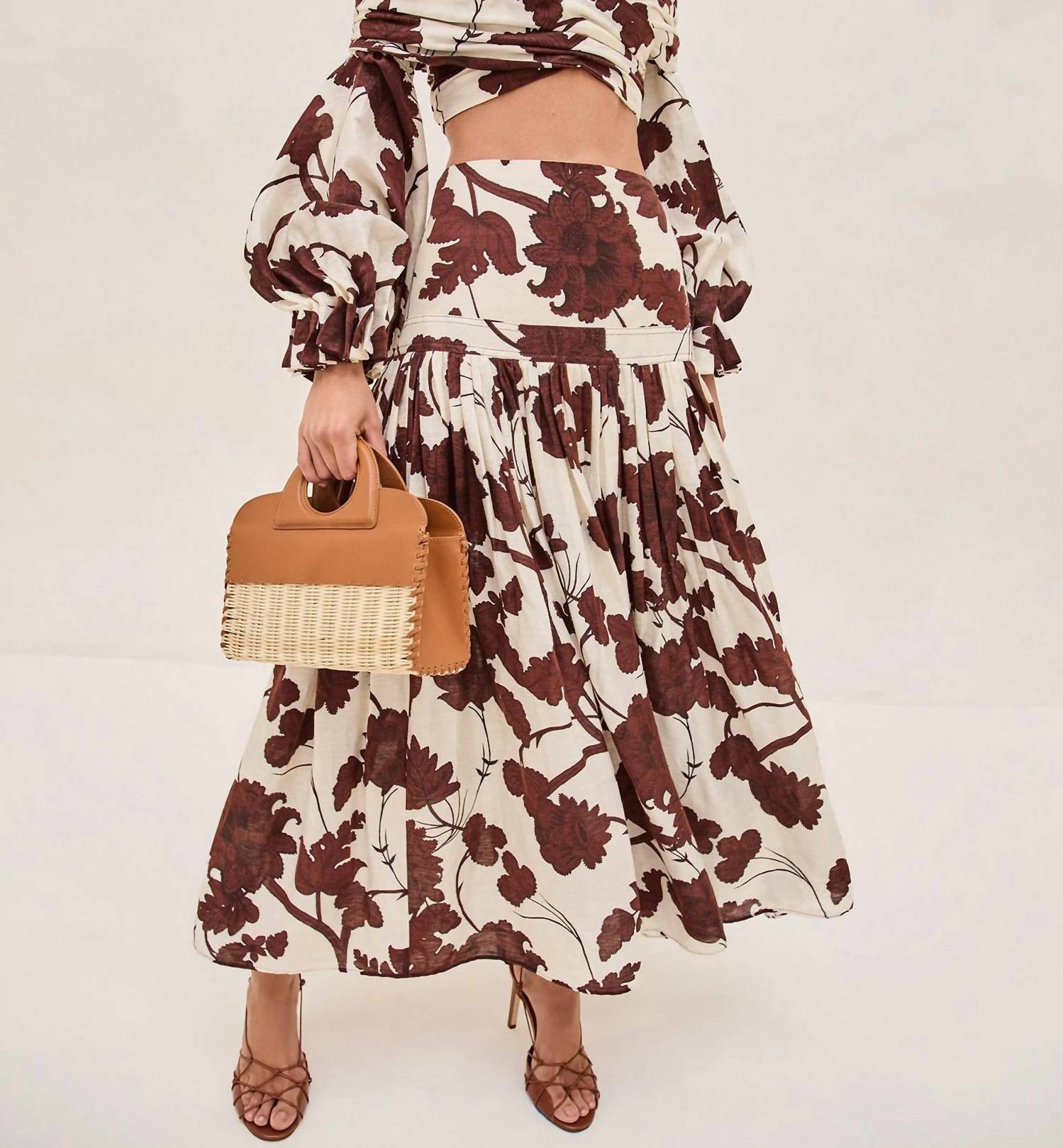 Pair this crop top with your favorite high-waisted jeans or maxi skirt. Discover the Trisha Top by Alexis, a stylish piece in Obsidian Brown with a floral pattern that adds a touch of elegance to your wardrobe. This off-the-shoulder crop top features long sleeves and a chic twisted front detail. Crafted from a luxurious blend of 76% Rayon, 21% Nylon, and 3% Linen, it has a convenient zip closure and is made in China. For best care, this top should be dry cleaned. The garment length is 6.25".