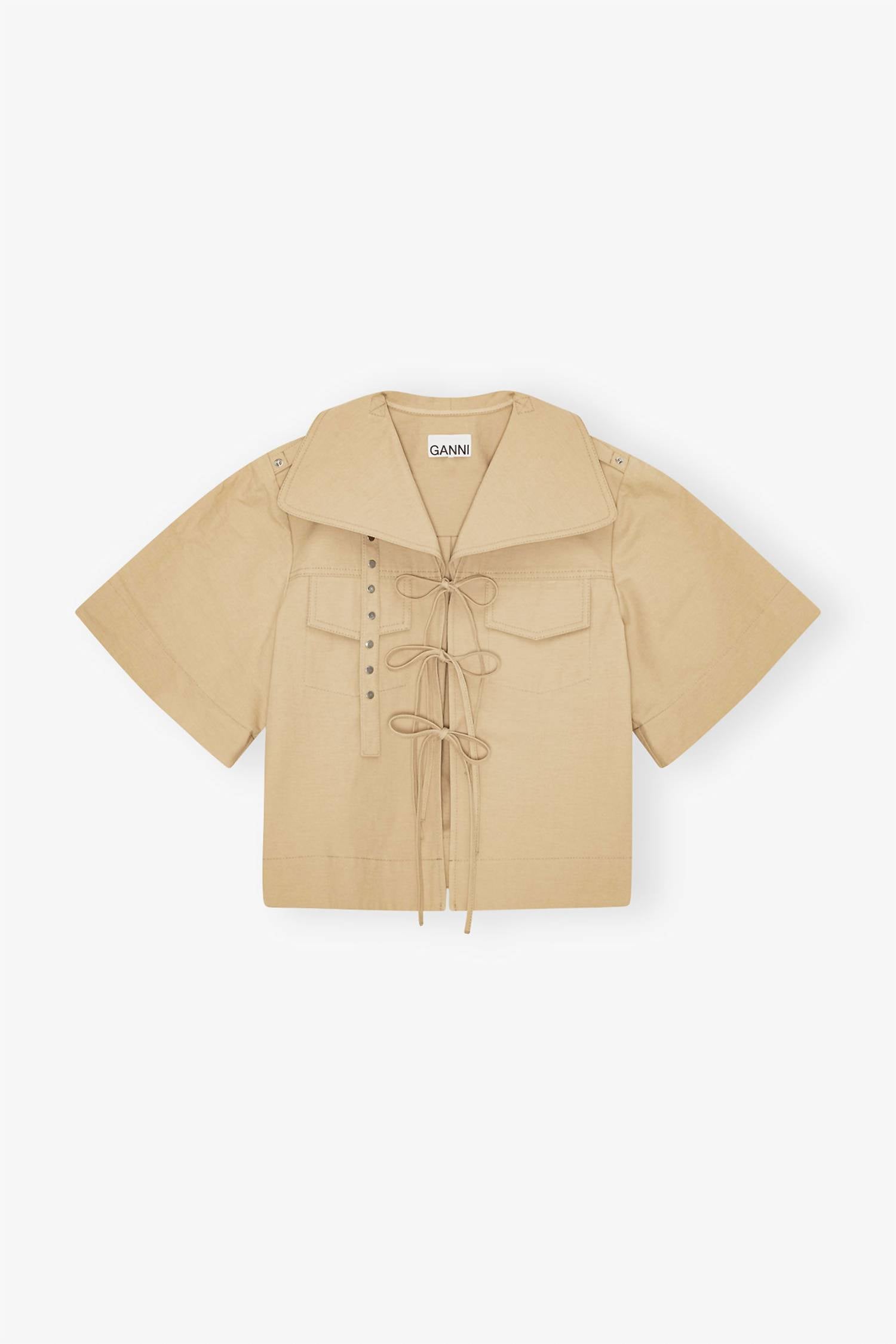 A timeless blouse that will never go out of style. Discover the sophisticated charm of the GANNI Classic Summer Suiting Cowl Neck Blouse in Pale Khaki, perfect for the minimalist wardrobe. This blouse features short adjustable sleeves and a chic collar neckline, crafted from a Cotton Blend for comfort. The thoughtful design includes two front pockets and a trendy deep V-neckline with three tie bands for a unique closure style. Originating from TR, this blouse is ideal for travel and special occasions like Thanksgiving.
