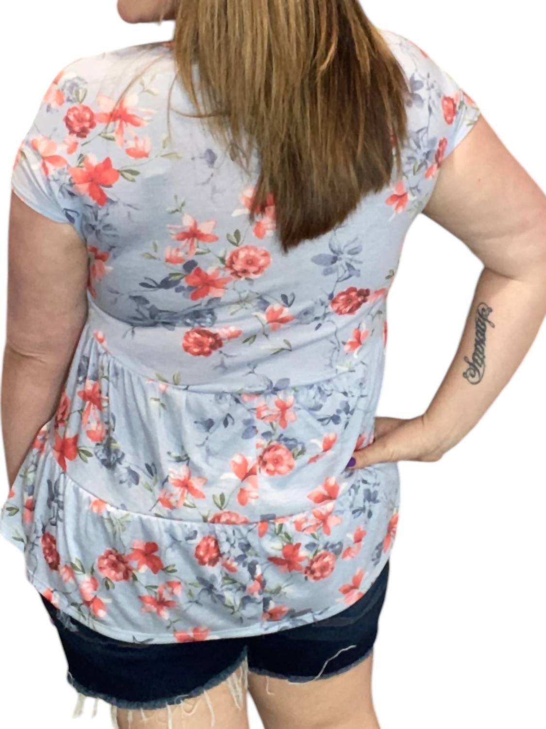 Floral Print. Short Sleeve. Crew neckline. Pull-on style. 65% Polyester 35% Rayon. Imported.