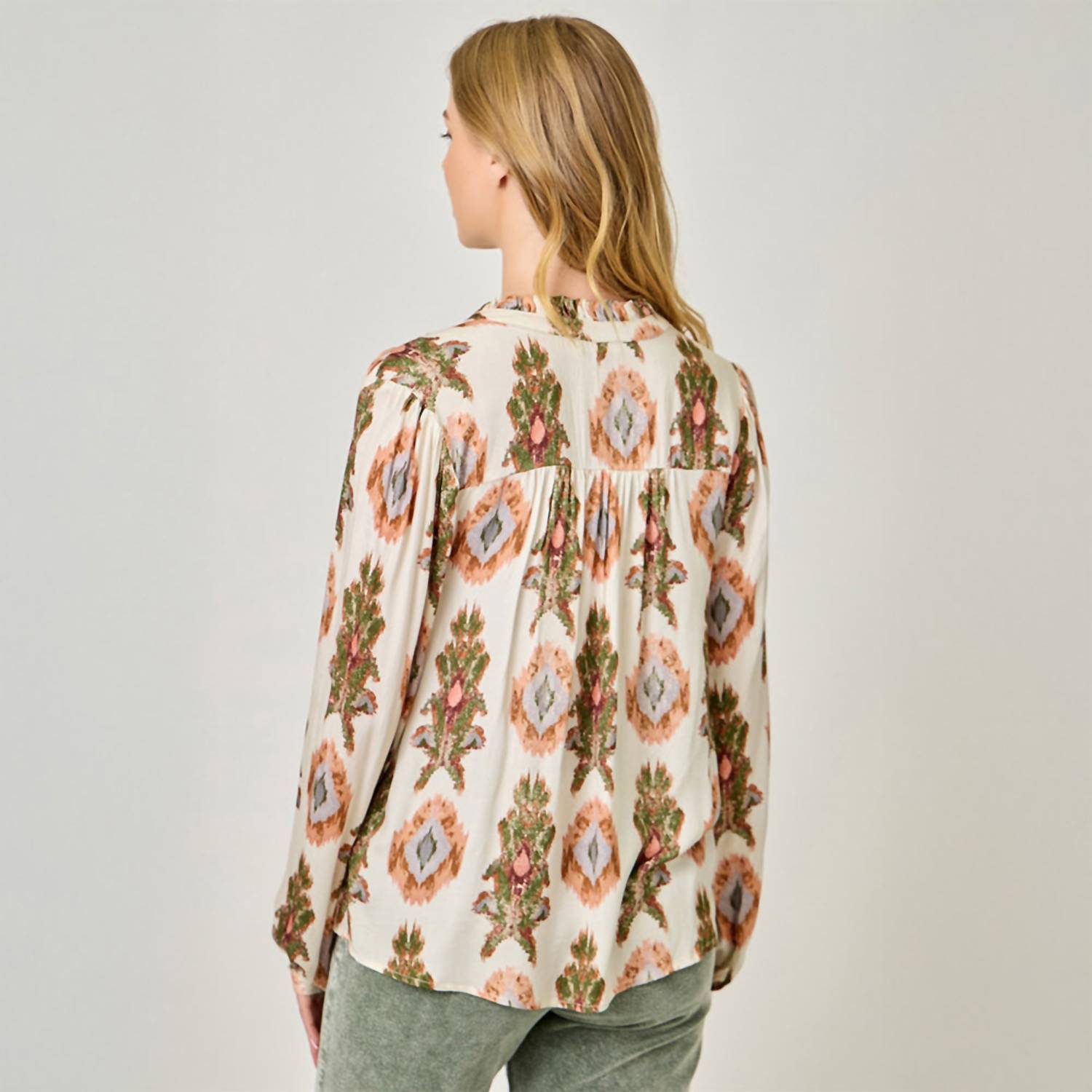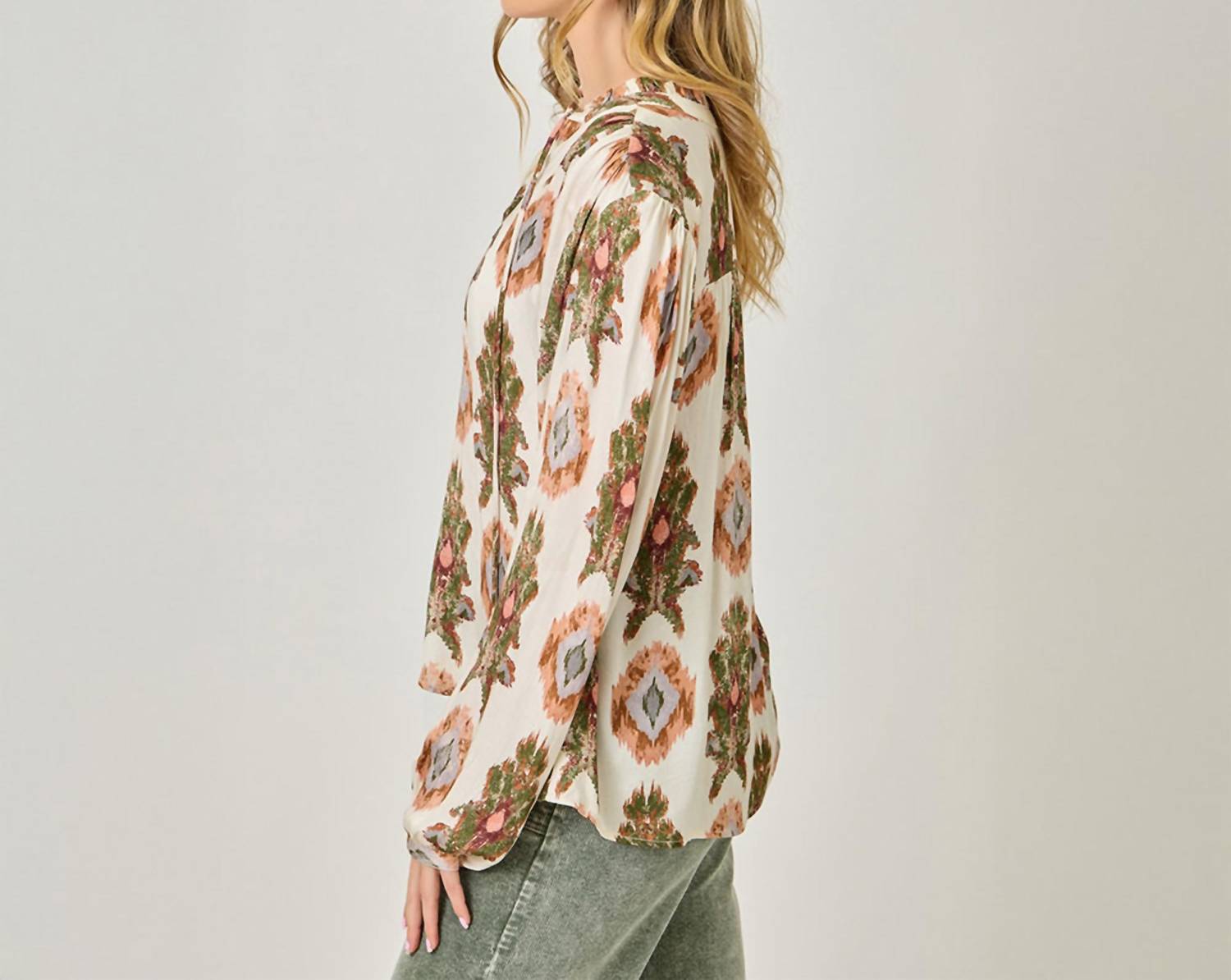 A timeless blouse that will never go out of style. Embrace effortless charm with the Harvest Bloom Blouse by Mystree, designed in an enchanting ivory tribal pattern. This stylish blouse features long bubble sleeves and a playful sliced V-neck with a tie detail. Crafted from soft 100% rayon, it adds a whimsical touch to your wardrobe while ensuring flow and comfort. Closure: Pull-on style.