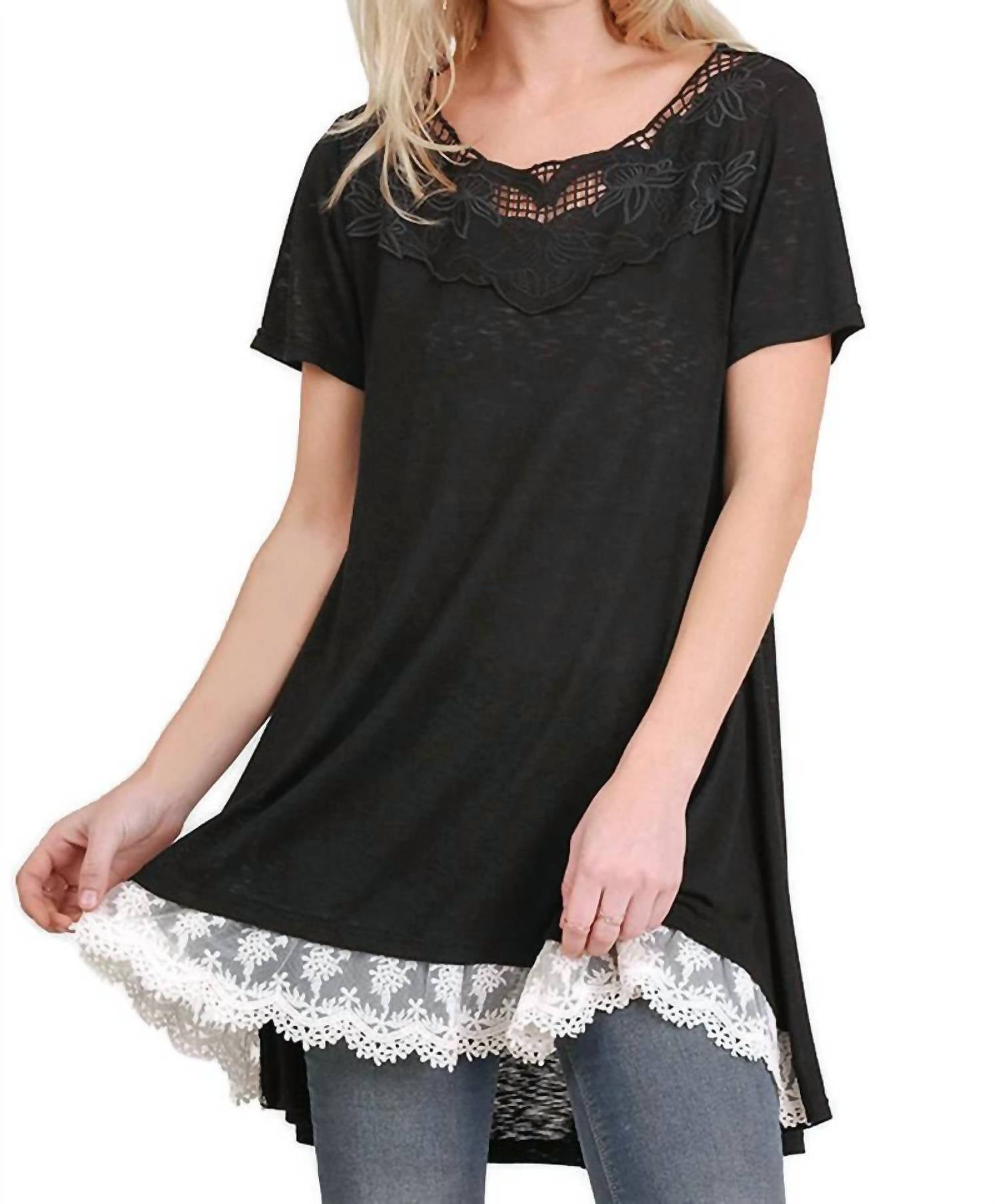 A perfect addition to any wardrobe, this classic tunic style blouse is flattering and effortless. You can easily transition from desk to dinner in this chic top. Elevate your summer wardrobe with the Floral Crochet Lace Trim Tunic by Umgee, an essential piece for sunny days. This black tunic features short sleeves and a floral crochet neckline, complemented by a lace-trimmed high-low hemline. Composition: Poly Cotton Blend, Closure: Pull-on. Available in sizes: Small (Bust 36", Length 28"), Medium (Bust 38", Length 28"), Large (Bust 40", Length 28"), with the back slightly longer. Ideal for a boho-chic look on vacation or casual outings.