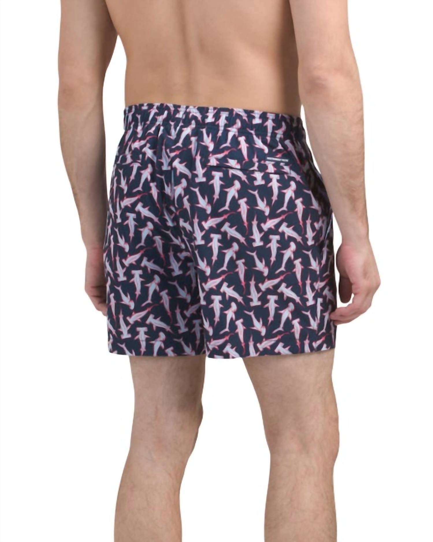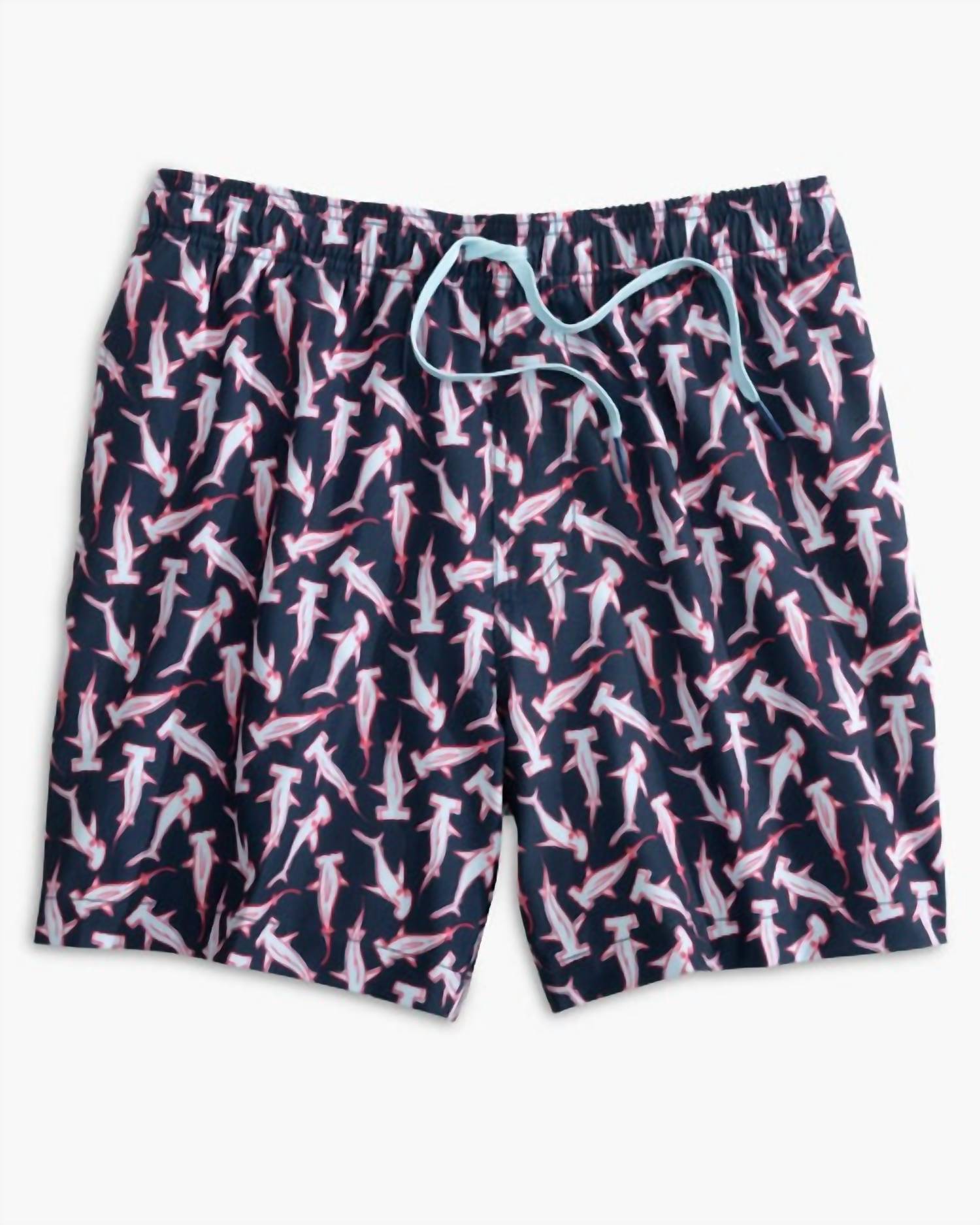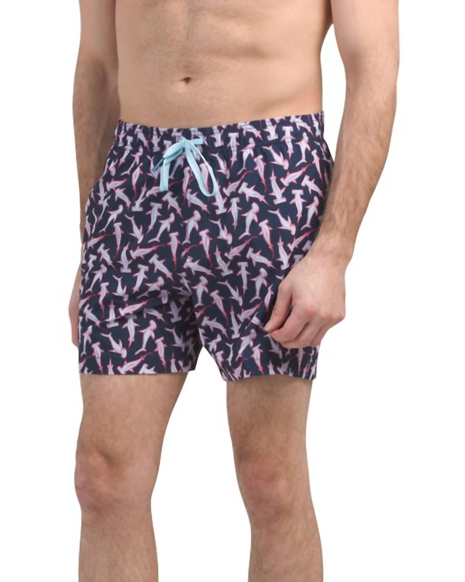 Hit the nail on the head for summer fun in our Hammerhead Shark print swim trunk. A fully elasticized waistband, the flexible, UV-protective material hammers home comfort. Construction includes a micro-mesh brief liner, front hand pockets, and a back patch pocket. 52% Polyester, 38% Recycled Polyester, 10% Spandex Machine Wash