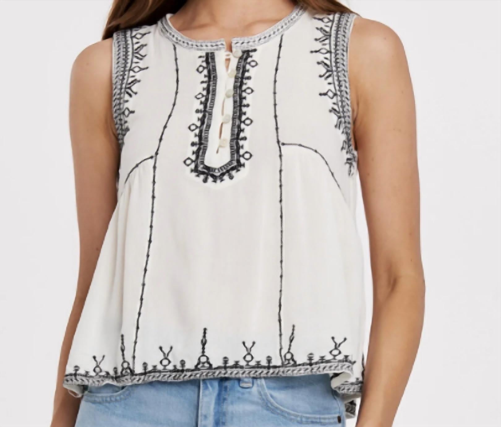 This classic tank top is perfect for layering and cute enough to wear on its own. Elevate your summer wardrobe with the Kit Tank Top by Another Love, featuring playful embroidery in a chic cream and black pattern. This sleeveless design offers a relaxed scoop neckline for easy style and comfort. Composition: 100% Rayon. Closure: Button closure. Ideal for vacation wear.