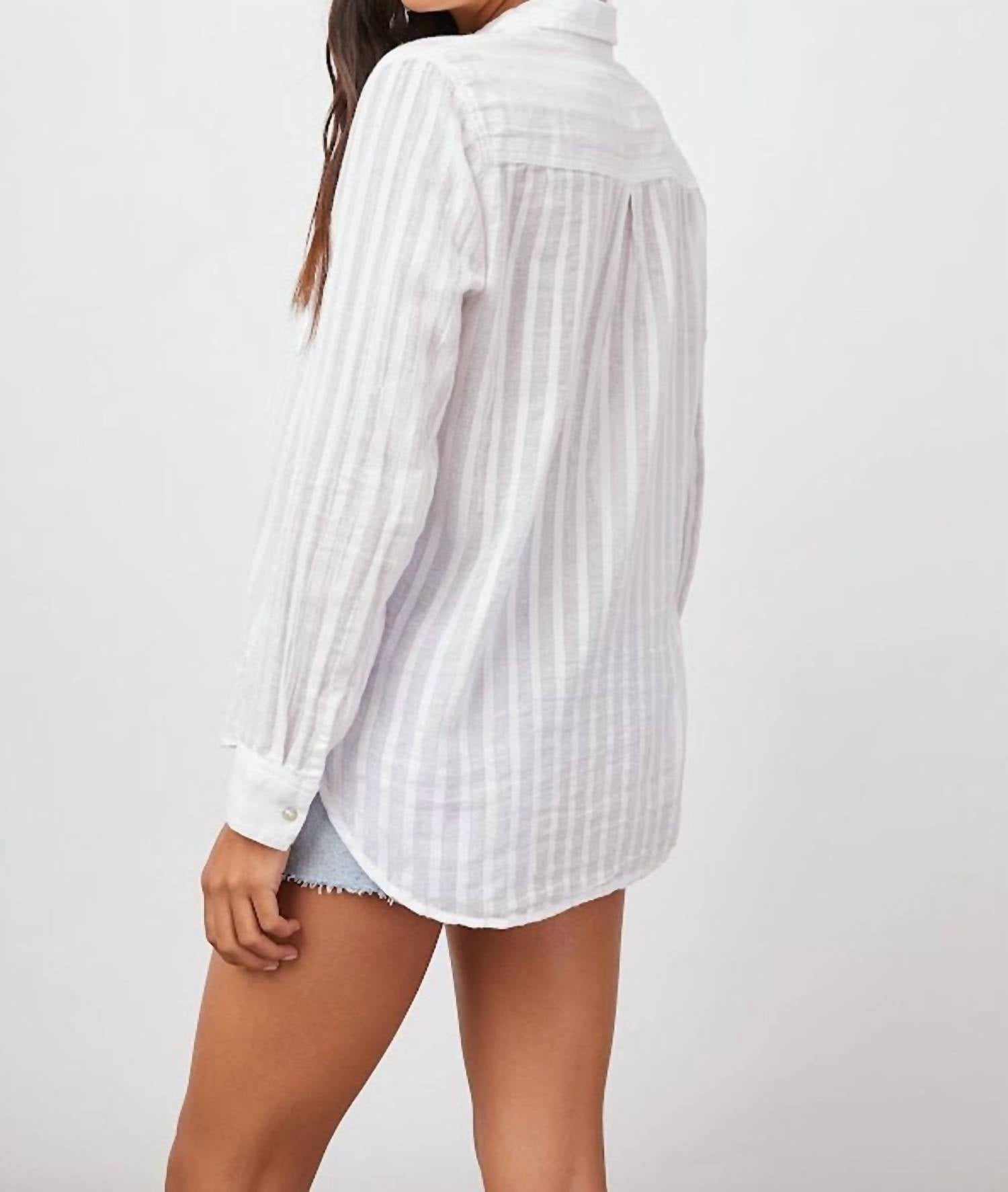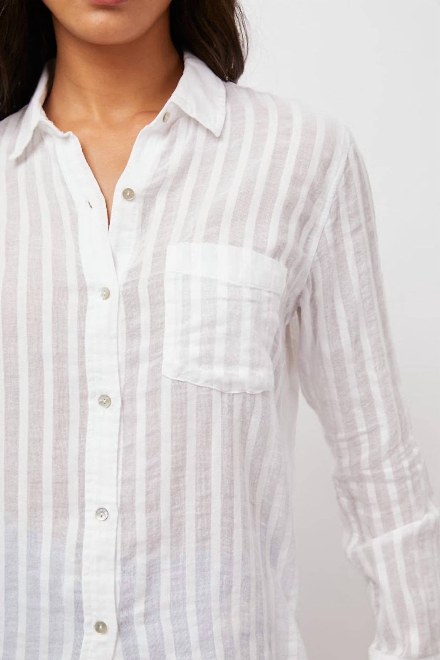 A long sleeve top you can wear with denim, skirts, well... just about anything! Meet the Charli Shirt by Rails, an essential long-sleeve addition to any well-rounded closet with its classic stripe pattern. This eco-friendly piece is crafted from a luxe linen blend of 55% linen and 45% rayon, offering both style and sustainability. Designed with thoughtful details such as a solo chest pocket and button closure, it’s perfect for travel and versatile enough to pair with a variety of outfits. The coastal California-inspired design ensures you're ready for any warm-weather adventure.