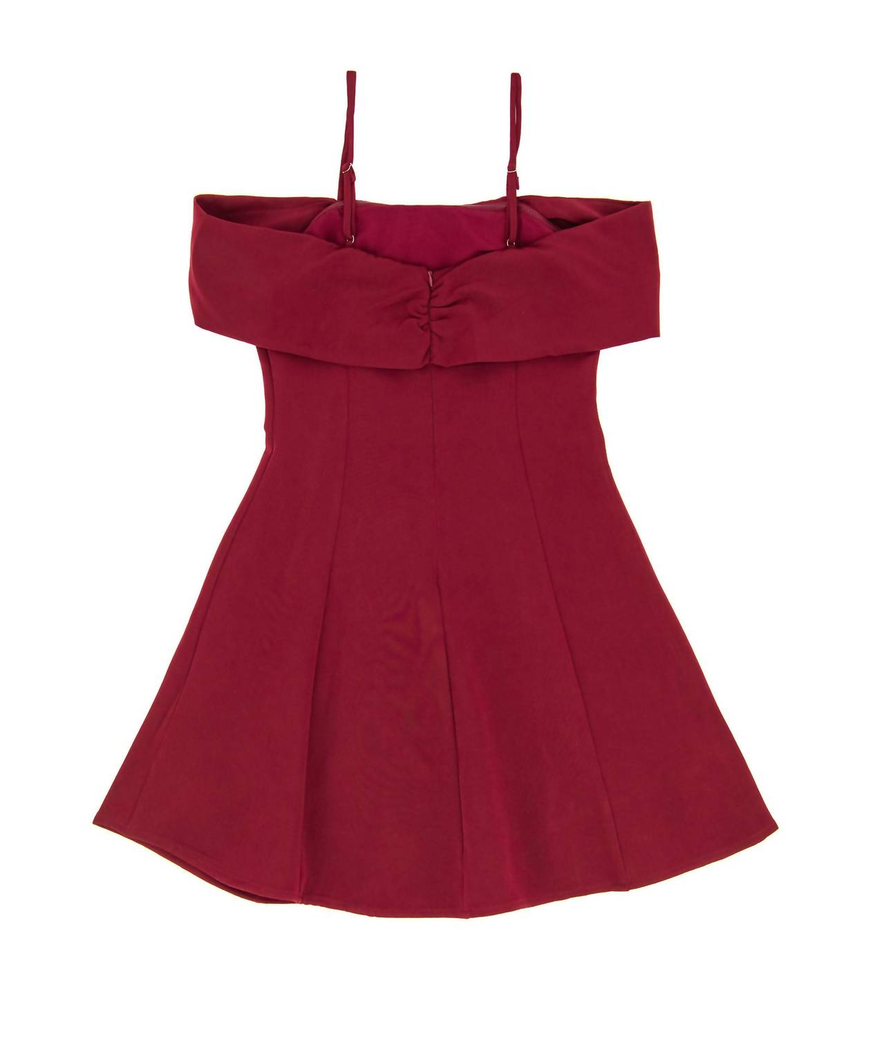 A short and breezy dress for those warmer days. Introducing the 8apart Women's Paige Bow Mini Dress in striking burgundy, a perfect statement piece for cocktail parties. This fit and flare silhouette features delicate spaghetti straps and an off-the-shoulder neckline, accentuated by a charming bow design. Made for effortless elegance with a minimalist approach, this dress ensures you shine at any festive occasion. Closure: Zip closure. Ideal for a summer setting and designed for women looking to add a touch of sophistication to their Valentine's Day ensemble.