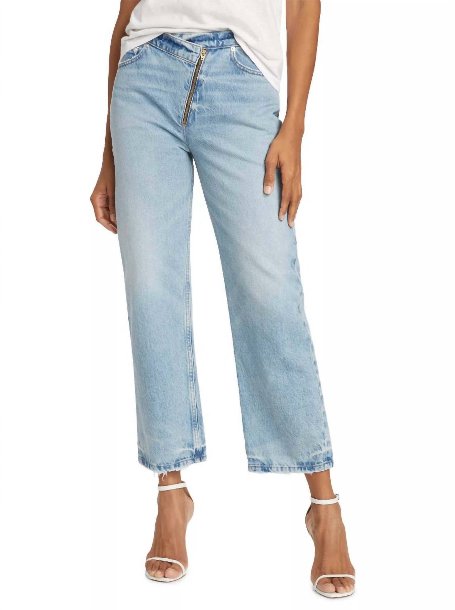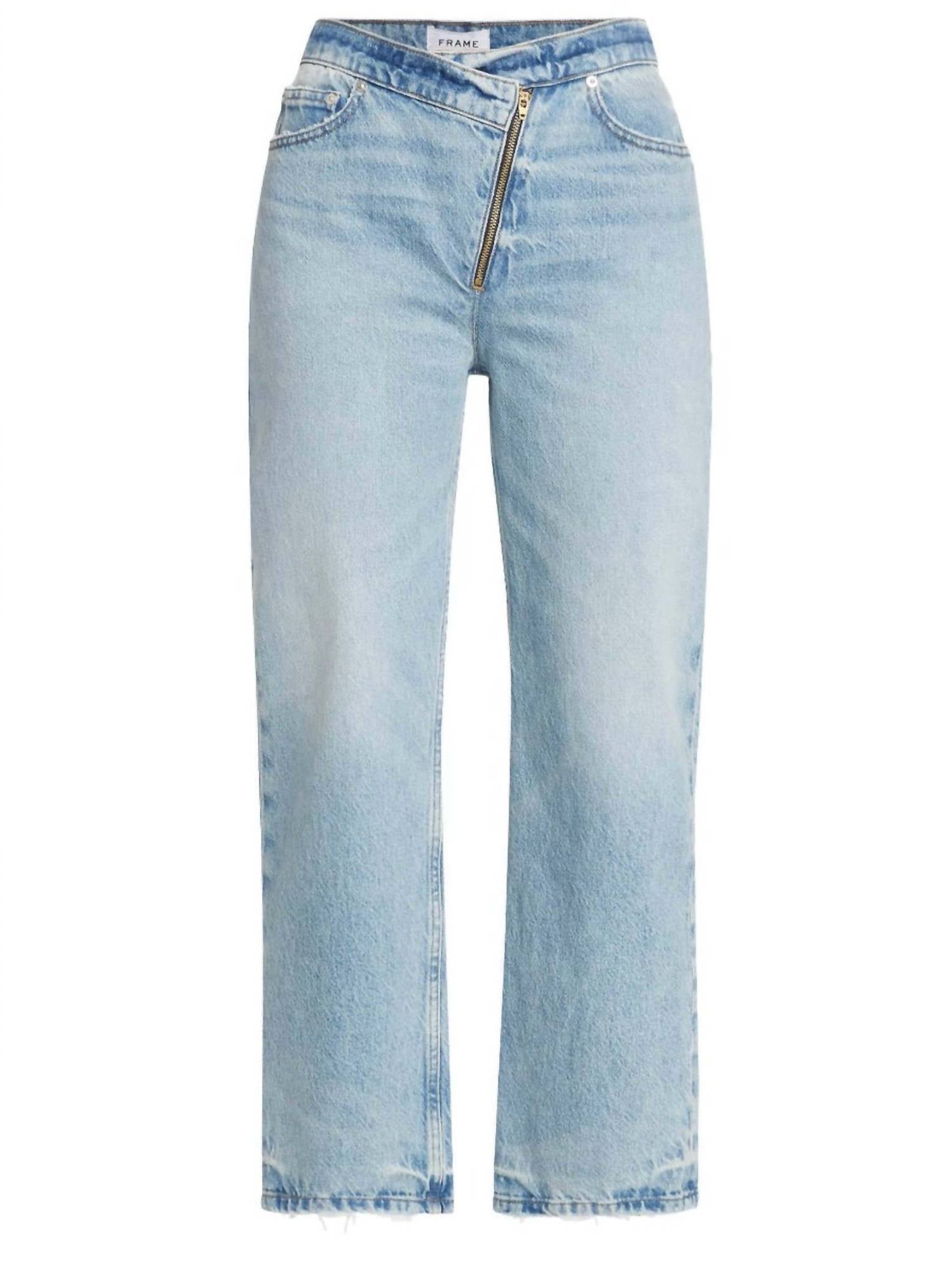 Introducing the LE JANE CROP ANGLED JEAN by FRAME, a perfect blend of modern style and sustainable craftsmanship. Made from 80% regenerated cotton and 20% recycled cotton, these jeans feature a high-rise fit with a 10.25" rise and a 27" inseam. The straight leg crop highlights an angled front zipper and asymmetrical waistband, complemented by grinding details for a uniquely lived-in look. Closure type is a button closure, and the care instructions recommend machine wash cold for easy maintenance. Ideal for a classic fit, these light indigo jeans run true to size.