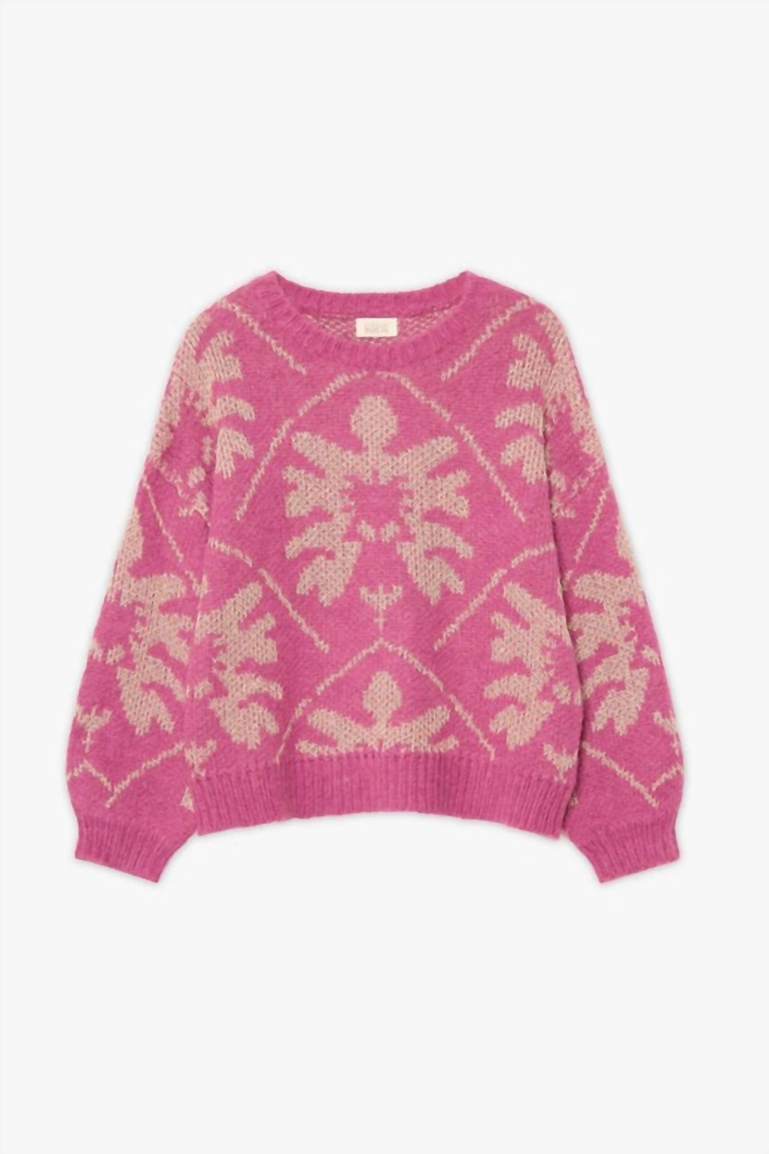 Indulge in luxury with the Nekane Fuschia Jacquard Print Lurex Sweater. Featuring a stunning jacquard print and sparkling lurex detail, this cozy sweater is a must-have for your wardrobe.