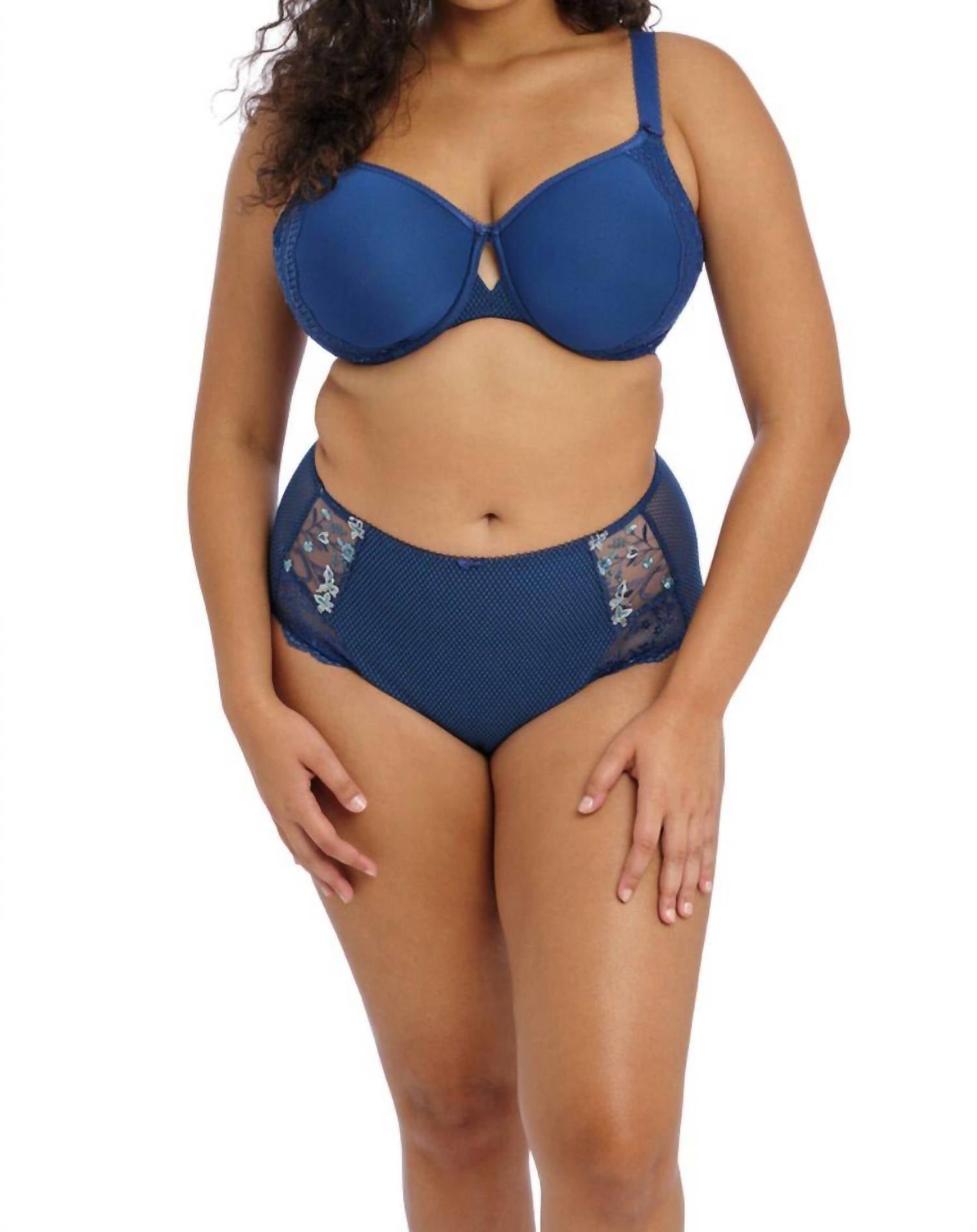 The most comfortable and stylish bra that you'll reach for daily. Introducing the Charley Underwire Moulded Spacer Bra by Elomi, an elegant choice crafted for a confident fit. This petrol-colored bra is beautifully adorned with diamond mesh embellishments and delicate floral embroidery, offering a textured pattern. Made from polyester, it is designed specifically for women who appreciate superior style and comfort. Care: Hand wash only.