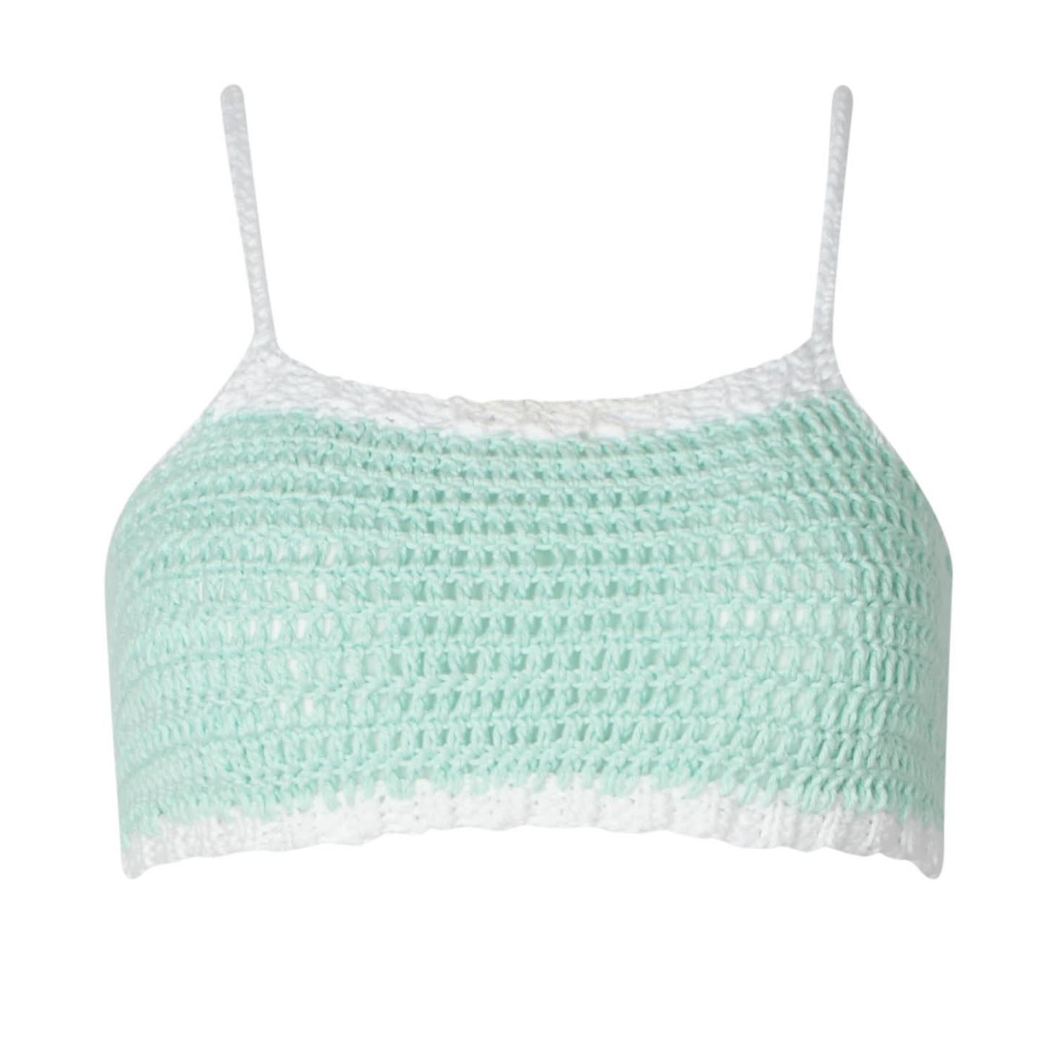 The perfect crop top for those warmer weather days. The Women's Gia Crochet Crop Top by SOAH is a boho chic essential for your summer wardrobe. With delicate spaghetti straps and a classic square neck silhouette, this pastel green top exudes effortless style. The adjustable lace-up back detail ensures a perfect fit, while the snap closure provides easy wear. Ideal for a beach day, this textured piece is designed to turn heads.