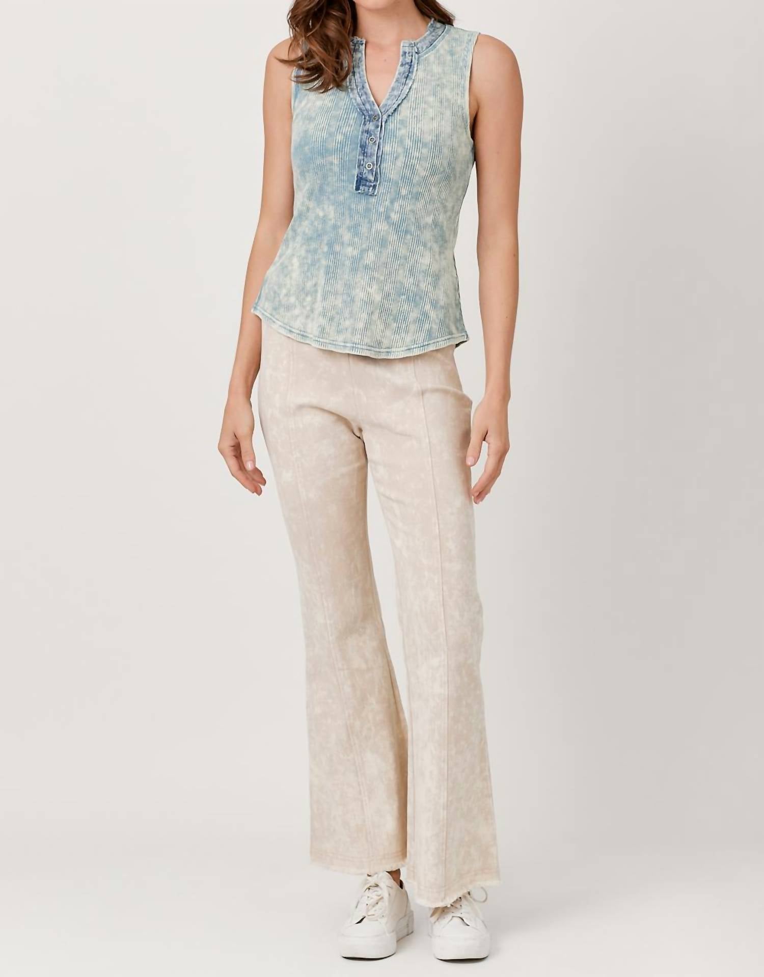 Fit, fabric and functionality. This tank top checks all the boxes. Discover the Washed Sleeveless Thermal Henley Top by Mystree, a stylish choice for summer getaways. Crafted from a sage-colored cotton blend, this top features a sleeveless design with a split V-neck and button trim. The hi-lo hem adds a modern touch to its textured ribbed knit pattern. Easy care with machine wash and tumble dry. Ideal for vacation wear and minimalist trends.