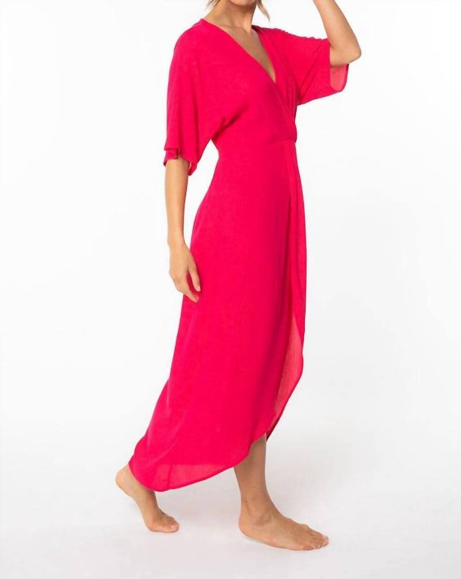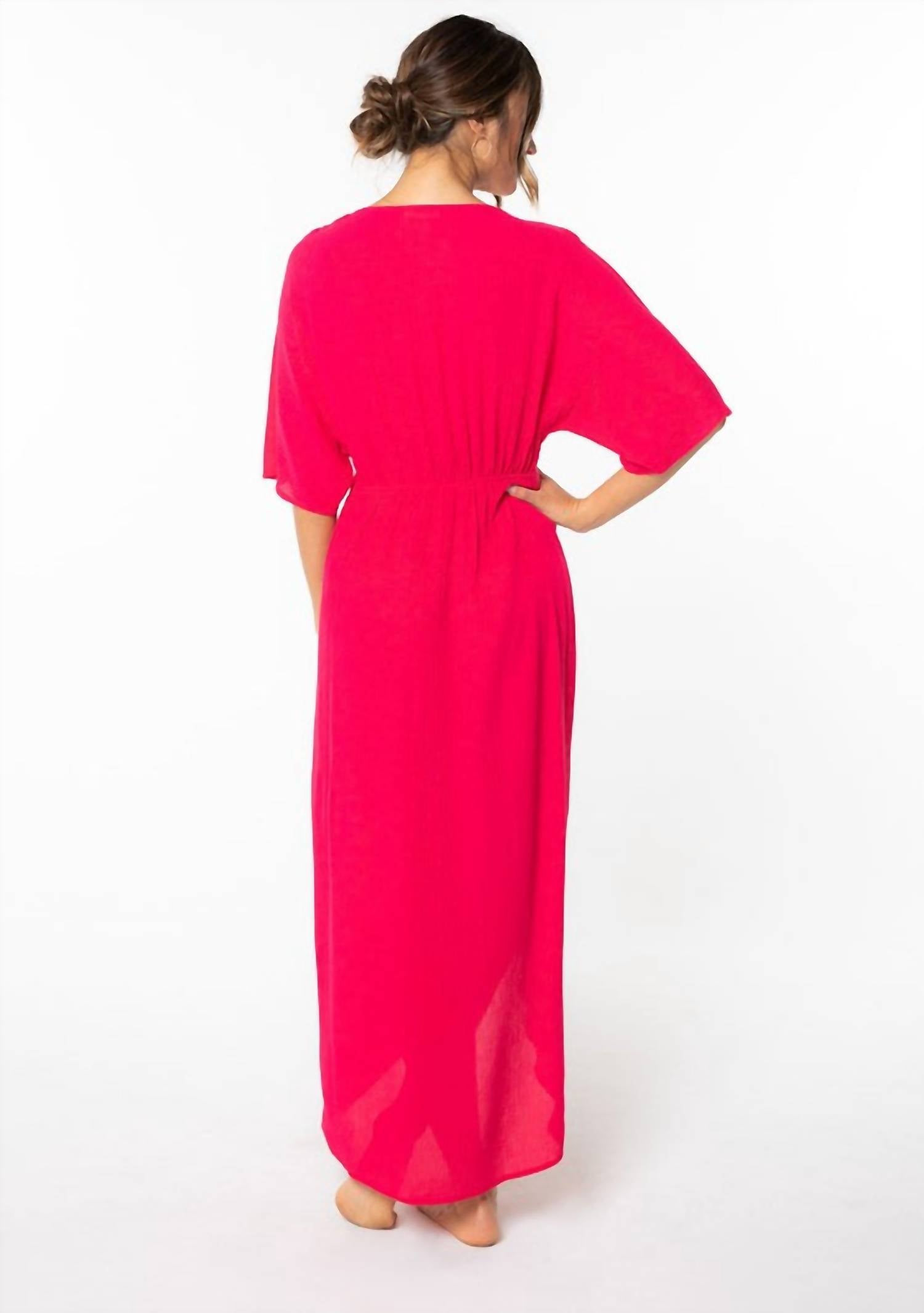 Style this maxi with your favorite statement necklace and sandals for the perfect look. Crinkle gauze. Relaxed fit. Half-length kimono sleeves. Maxi length. High/low asymmetric hemline. V-neckline. Faux wrap with snap button. Front knot detail. Front slit. Essential bohemian dress. Model is 5'9, wearing a size S. Hand wash cold.