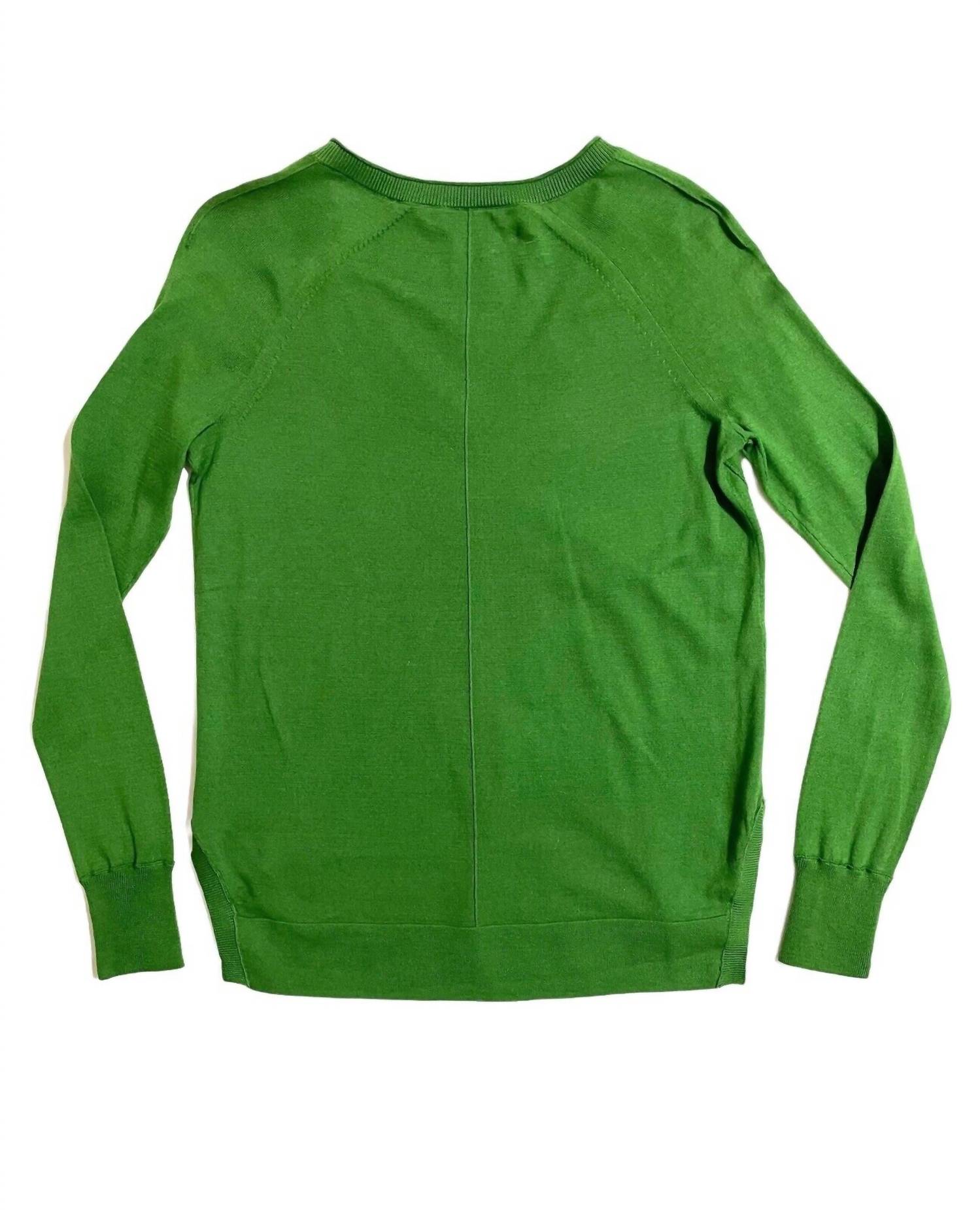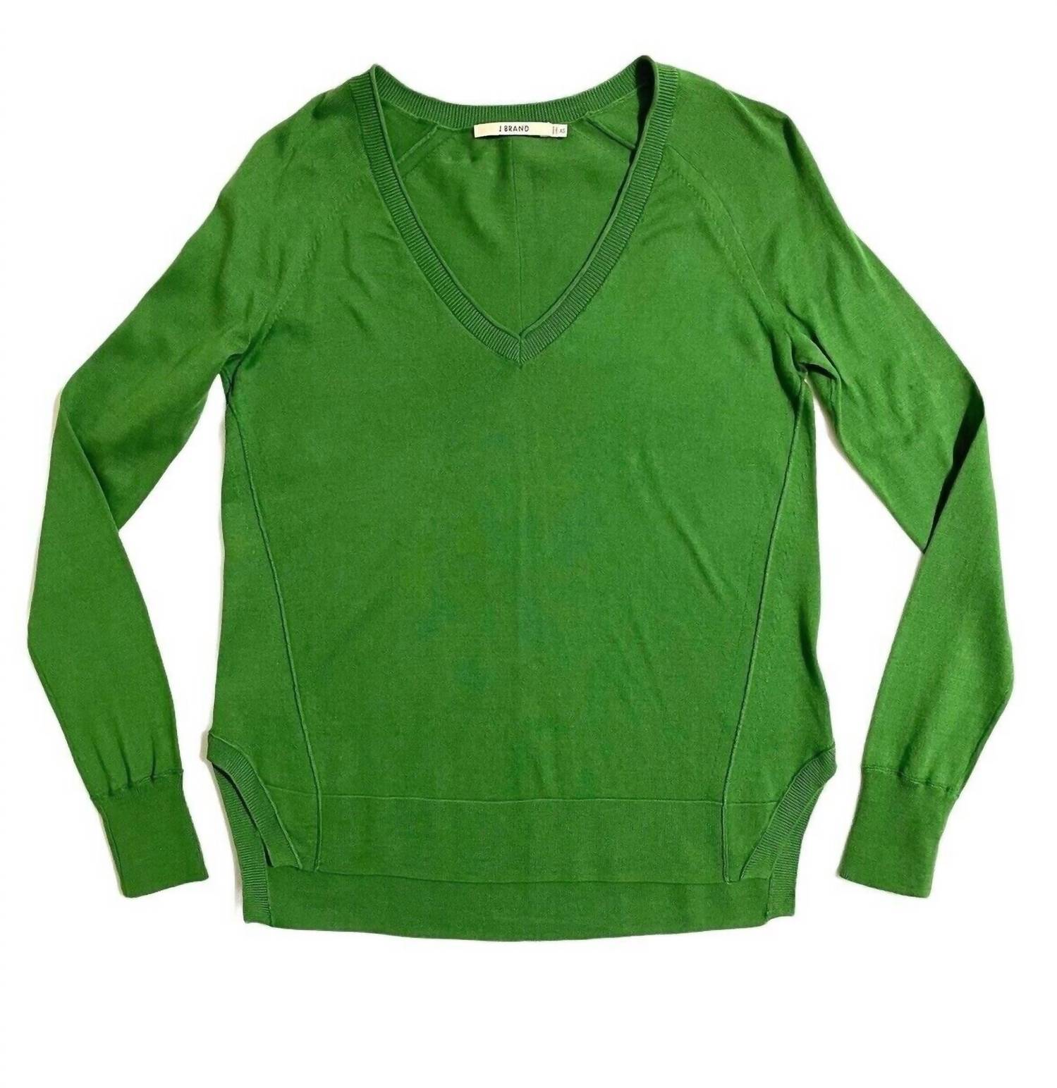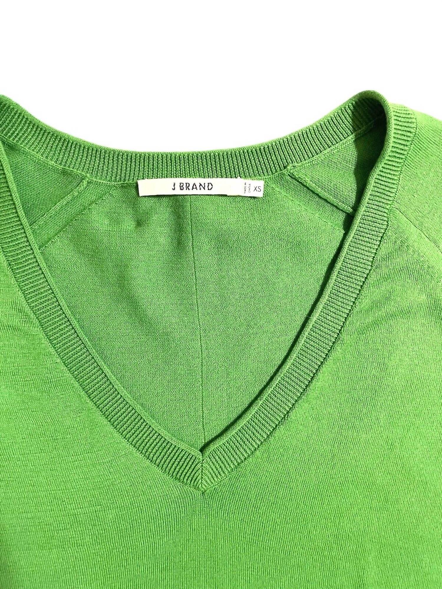 Embrace casual sophistication with the J BRAND Women's V-Neck Cotton Side Slits Relaxed Sweater in green. Crafted from 100% cotton, this sweater features a comfortable light knit, complemented by a stylish V-neck with ribbed trim. Long sleeves with ribbed cuffs and a high-low hem with side slits enhance its relaxed fit. Hand wash cold to maintain its classic design, with dimensions: length 23" - 24.75", shoulder 16", chest 18", sleeve 23.75".