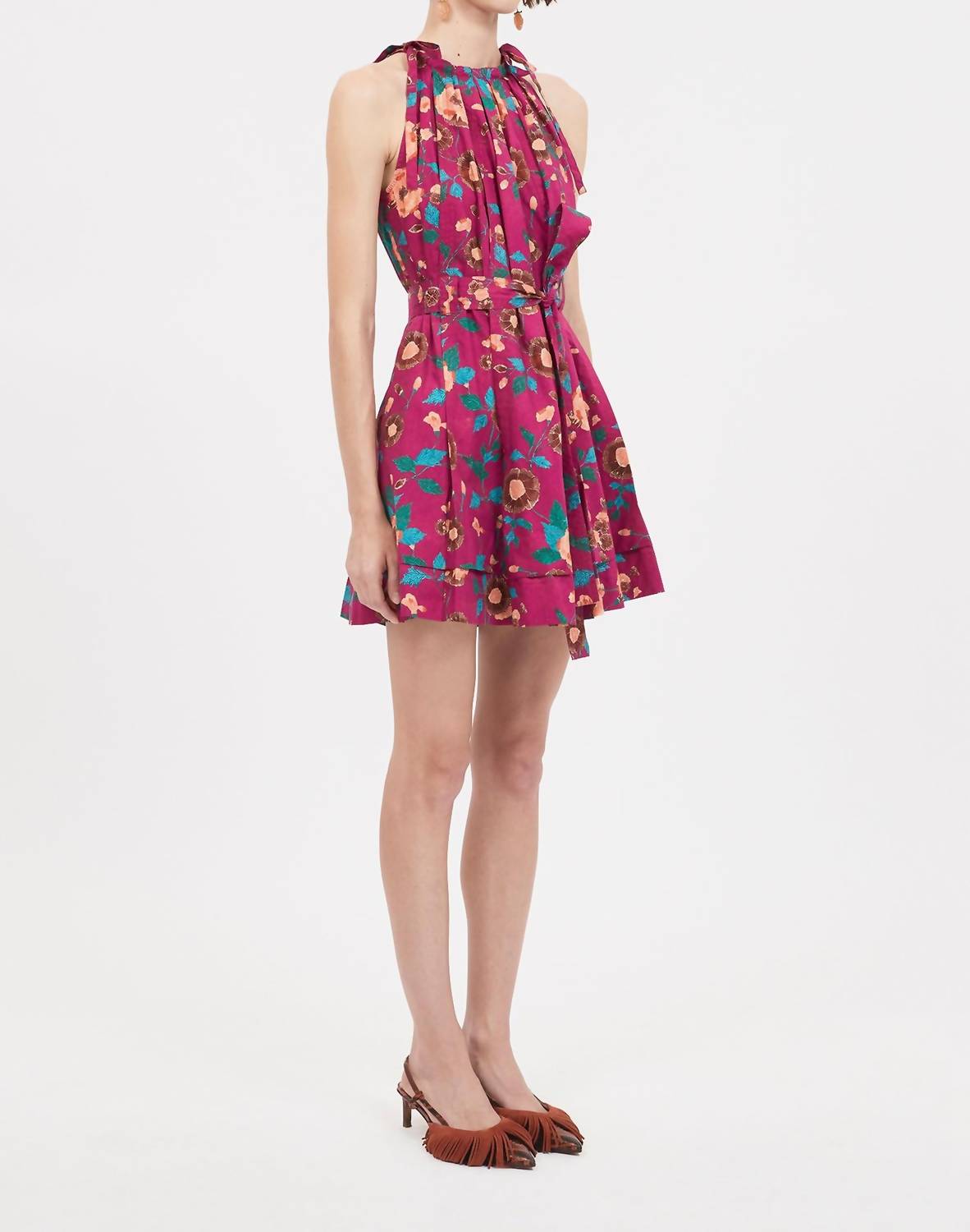 A short and breezy dress for those warmer days. Brienne Dress is made from crisp poplin with cascading bouquets that come alive against a vintage, batik-inspired backdrop. Featuring pink, blue, and orange hues, this breezy frock has a lightly pleated silhouette. Pull on style. Generous volume. Adjustable strap ties. Removable tie belt. Composition: 100% Cotton.