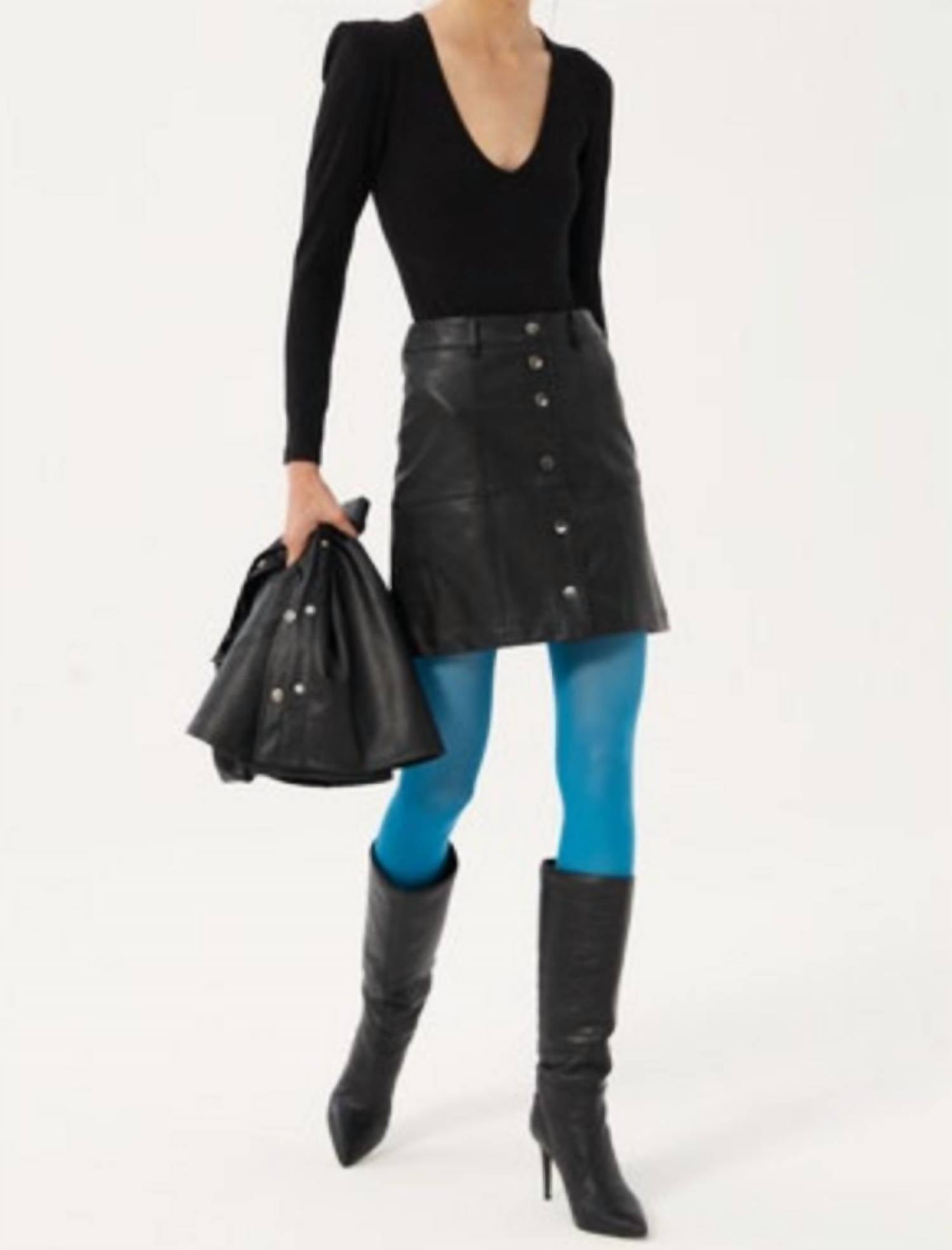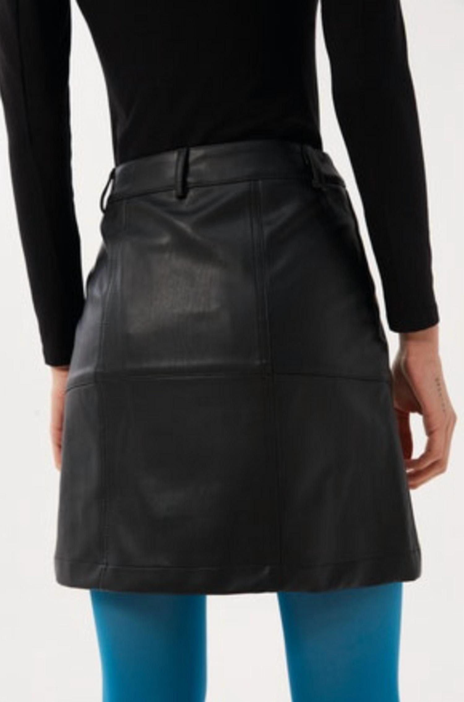 Tuck in your favorite tee for a more laid-back vibe. Elevate your wardrobe with the Bruma Mini Skirt by DELUC, crafted from sleek black vegan leather for a sophisticated look. This high-waisted, slim-fit skirt features button closures and belt loops, ensuring a perfect fit every time. 100% Vegan Leather. Spot or wipe clean as needed.