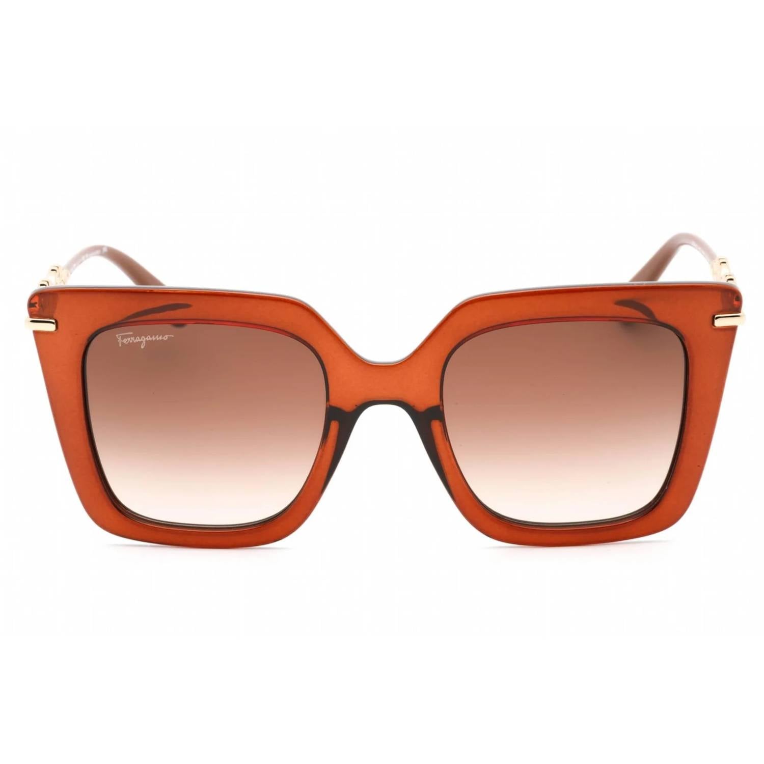Introducing the Women's SF1041S Sunglasses by Salvatore Ferragamo, a chic blend of style and functionality. These square, rimless sunglasses feature a transparent brown plastic frame ideal for oval and round face shapes, accentuated by rose brown gradient lenses. Equipped with category 2 UV protection, it's perfect for moderate sunlight. Dimension specifications include 51 mm lens width, 22 mm bridge, and 145 mm temple length, offering a secure and comfortable fit for every sun-soaked outing.