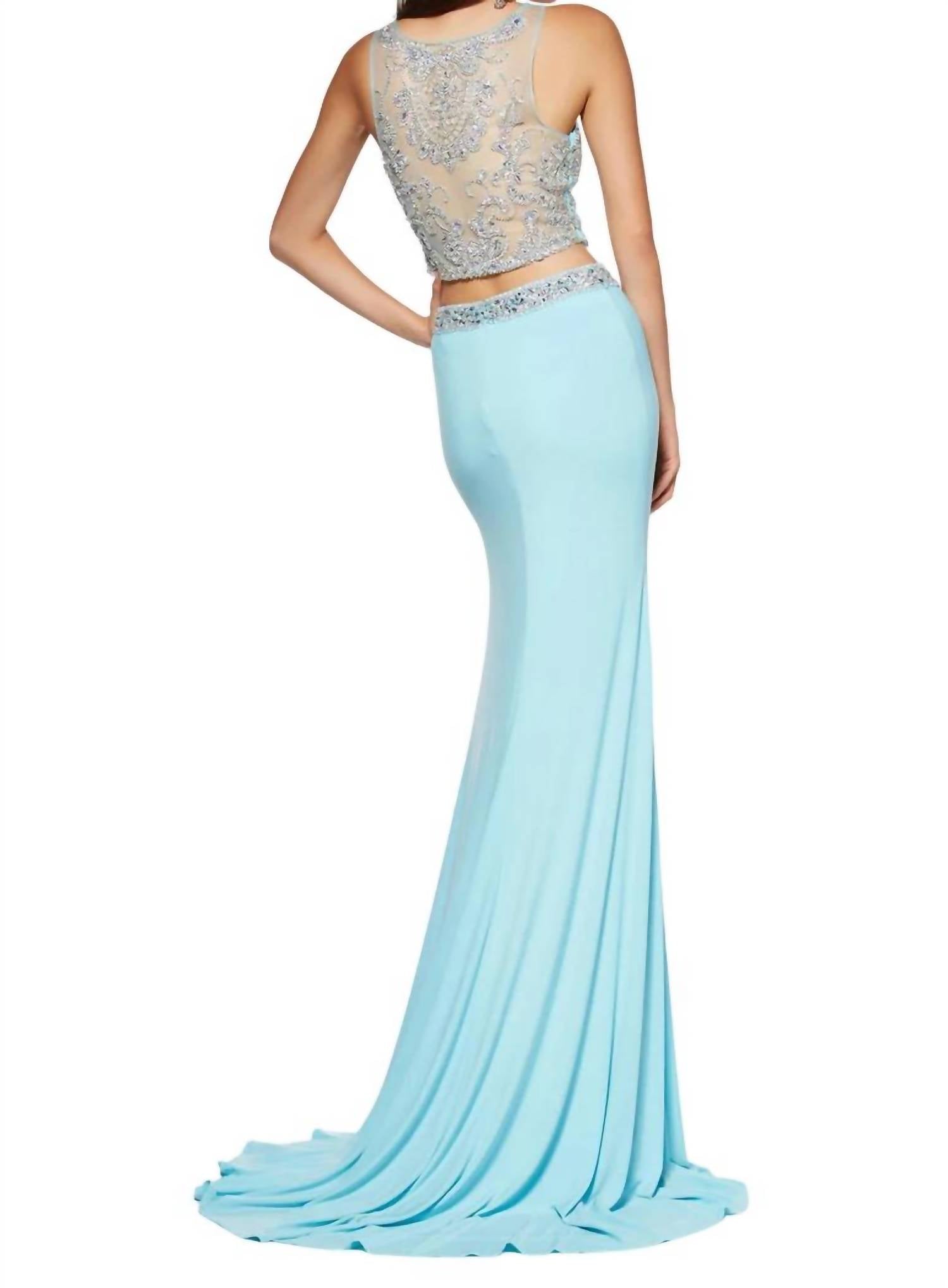 Features a beadwork and embroidery on a sheer neckline. High-waisted skirt. Embellished waistband. Thigh-high slit.